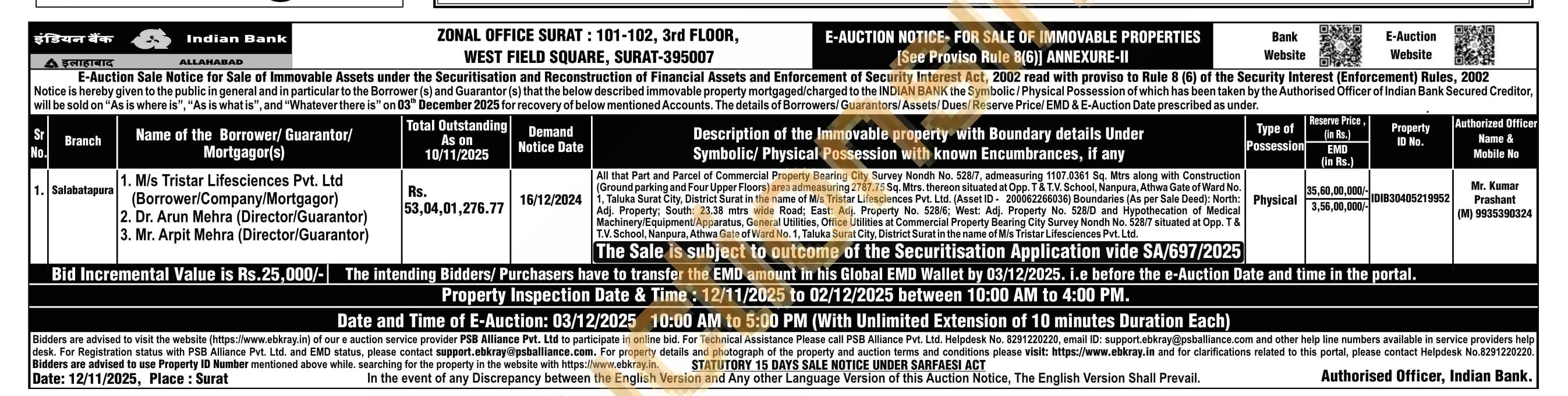 All that Part and Parcel of Commercial Property Bearing City Survey Nondh No. 528/7, admeasuring 1107.0361 Sq. Mtrs along with Construction (Ground parking and Four Upper Floors) area admeasuring 2787.75 Sq. Mtrs. thereon situated at Opp. T & T.V. School, Nanpura, Athwa Gate of Ward No. 1, Taluka Surat City, District Surat in the name of M/s Tristar Lifesciences Pvt. Ltd. (Asset ID 200062266036) Boundaries (As per Sale Deed): North: Adj. Property; South: 23.38 mtrs wide Road; East: Adj. Property No. 528/6; West: Adj. Property No. 528/D and Hypothecation of Medical Machinery/Equipment/Apparatus, General Utilities, Office Utilities at Commercial Property Bearing City Survey Nondh No. 528/7 situated at Opp. T & T.V. School, Nanpura, Athwa Gate of Ward No. 1, Taluka Surat City, District Surat in the name of M/s Tristar Lifesciences Pvt. Ltd.