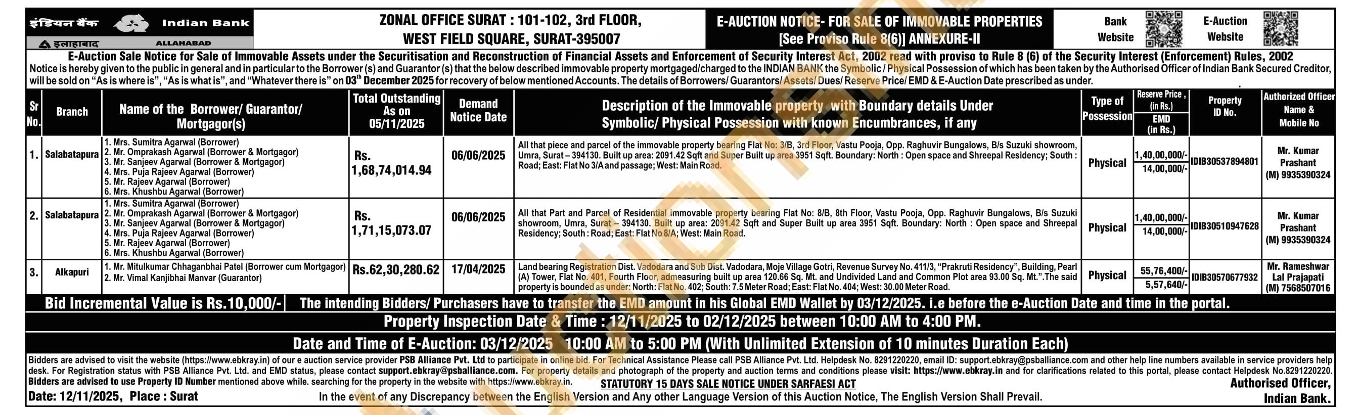 All that Part and Parcel of Residential immovable property bearing Flat No: 8/B, 8th Floor, Vastu Pooja, Opp. Raghuvir Bungalows, B/s Suzuki showroom, Umra, Surat - 394130. Built up area: 2091.42 Sqft and Super Built up area 3951 Sqft. Boundary: North: Open space and Shreepal Residency; South: Road; East: Flat No 8/A; West: Main Road.
