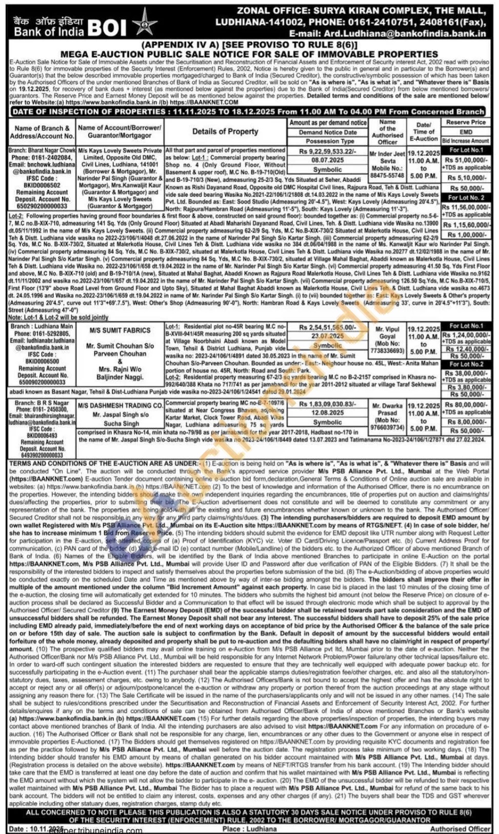All that part and parcel of properties mentioned as below: Lot-1; Commercial property bearing Shop no. 4 (Only Ground Floor, Without Basement & upper roof), M.C No. B-19-710(Old) and B-19-710/3 (New), admeasuring 25-2/3 Sq. Yds Situated at Seher, Abaddi Known as Rishi Dayanand Road, Opposite old DMC Hospital Civil lines, Rajpura Road, Teh & Distt. Ludhiana vide sale deed bearing Wasika No.2021-22/106/1/21808 dt.14.03.2022 in the name of Mis Kays Lovely Sweets Pvt. Ltd. Bounded as: East: Sood Studio (Admeasuring 20-4.5"), West: Kays Lovely (Admeasuring 20'4.5"). North: Rajpura/Hambran Road (Admeasuring 11'-5"), South: Kays Lovely (Admeasuring 11'-3