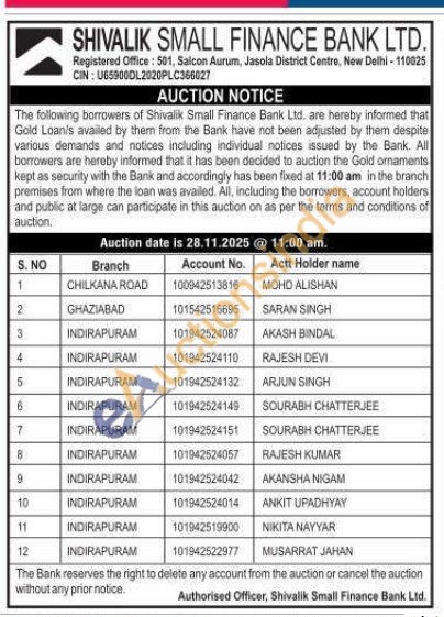 Shivalik Small Finance Bank Ltd Gold Auctions Auction in New Delhi