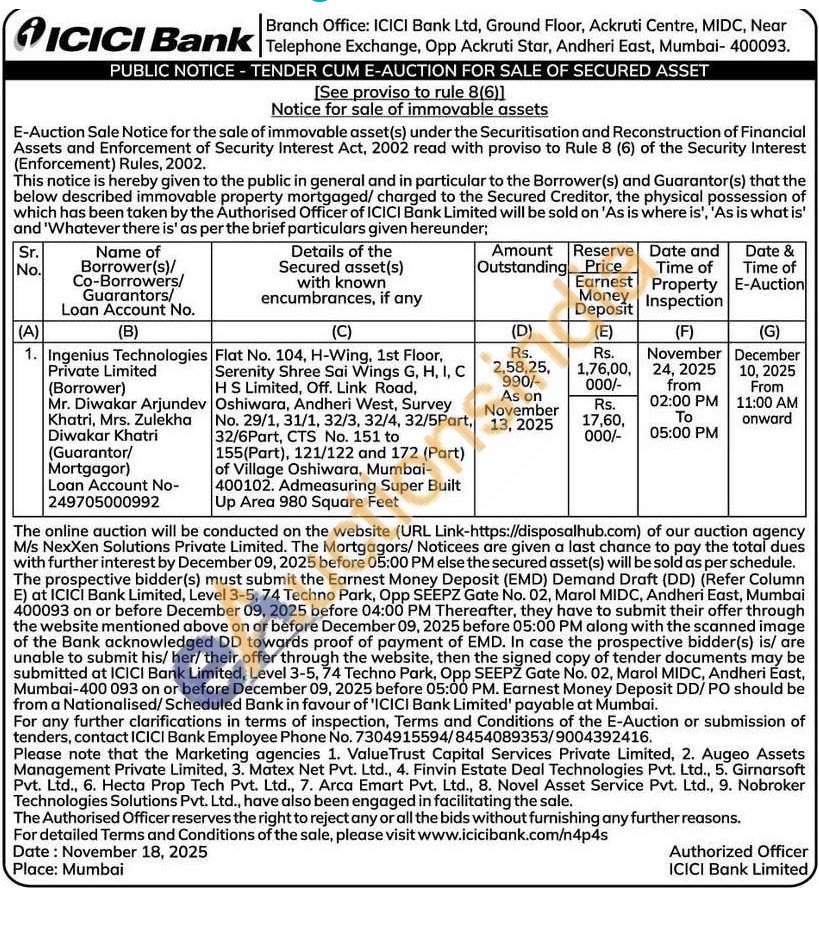 Flat No. 104, H-Wing, 1st Floor, Serenity Shree Sai Wings G, H, I, C HS Limited, Off. Link Road, Oshiwara, Andheri West, Survey 400102. Admeasuring Super Built Up Area 980 Square Feet No. 29/1, 31/1, 32/3, 32/4, 32/5Part, 32/6Part, CTS No. 151 to 155(Part), 121/122 and 172 (Part) of Village Oshiwara, Mumbai