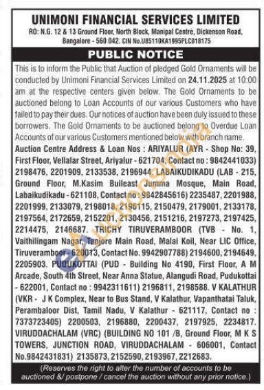 Unimoni Financial Services Limited Gold Auctions Auction in Bengaluru