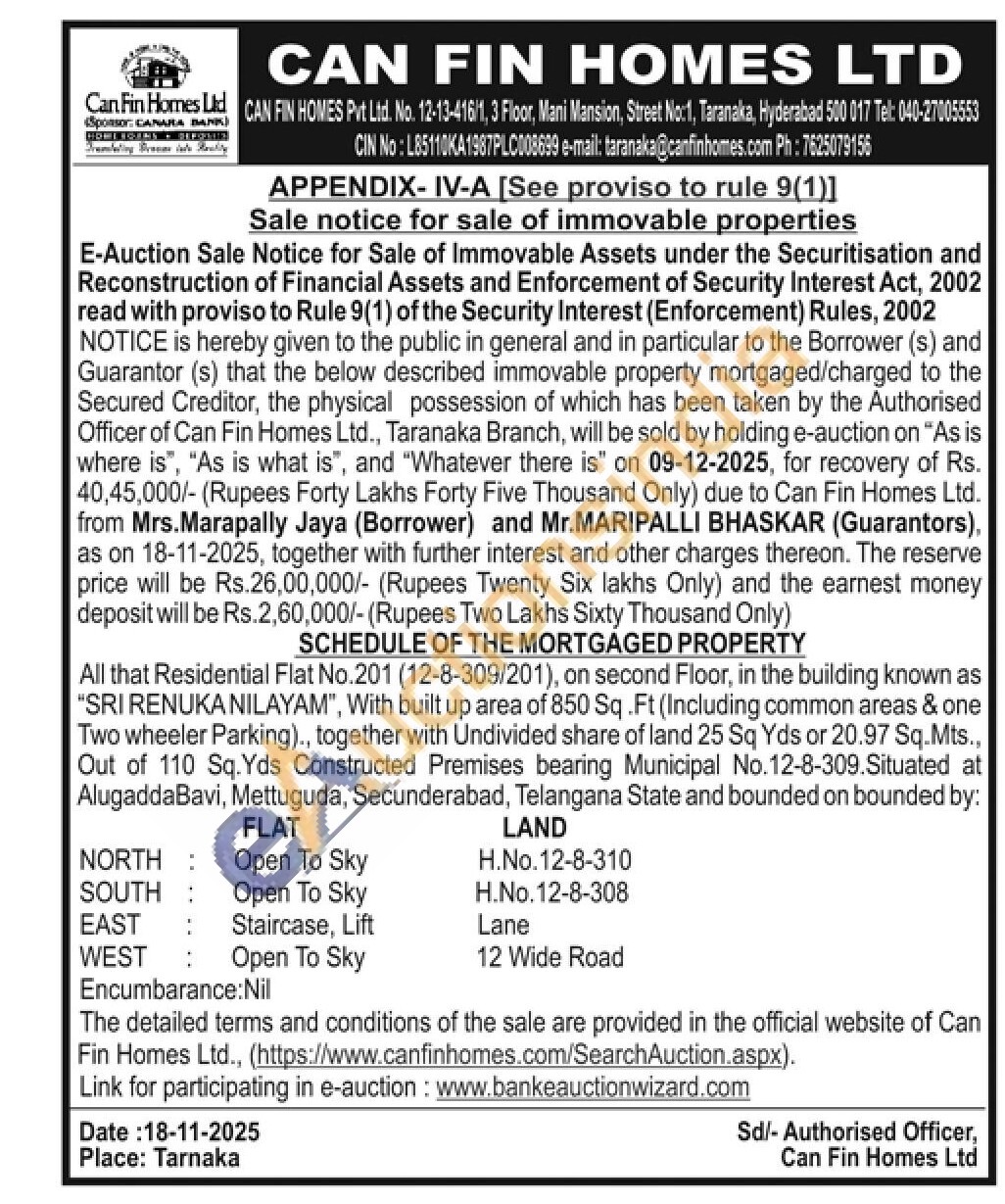 All that Residential Flat No.201 (12-8-309/201), on second Floor, in the building known as "SRI RENUKA NILAYAM", With built up area of 850 Sq. Ft (Including common areas & one Two wheeler Parking)., together with Undivided share of land 25 Sq Yds or 20.97 Sq.Mts., Out of 110 Sq. Yds Constructed Premises bearing Municipal No.12-8-309.Situated at AlugaddaBavi, Mettuguda, Secunderabad, Telangana State and bounded