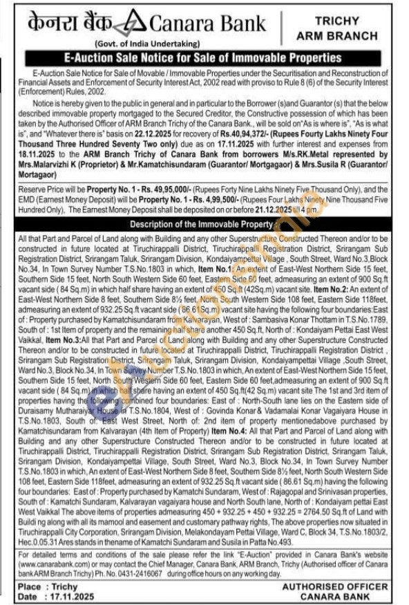 All that Part and Parcel of Land along with Building and any other Superstructure Constructed Thereon and/or to be constructed in future located at Tiruchirappalli District, Tiruchirappalli Registration District, Srirangam Sub Registration District, Srirangam Taluk, Srirangam Division, Kondaiyampettai Village, South Street, Ward No.3,Block No.34, In Town Survey Number T.S.No. 1803 in which, Item No.1: An extent of East-West Northern Side 15 feet, Southern Side 15 feet, North South Western Side 60 feet, Eastern Side 60 feet, admeasuring an extent of 900 Sq.ft vacant side (84 Sq.m) in which half share having an extent of 450 Sq.ft (42Sq.m) vacant site. Item No.2: An extent of East-West Northern Side 8 feet, Southern Side 8% feet, North South Western Side 108 feet, Eastern Side 118feet, admeasuring an extent of 932.25 Sq.ft vacant side (86.61Sq.m) vacant site having the following four boundaries East of: Property purchased by Kamatchisundaram from Kalvarayan, West of: Sambasiva Konar Thottam in T.S.No. 1789, South of: 1st Item of property and the remaining half share another 450 Sq.ft. North of: Kondaiyam Pettai East West Vaikkal, Item No.3:All that Part and Parcel of Land along with Building and any other Superstructure Constructed Thereon and/or to be constructed in future located at Tiruchirappalli District, Tiruchirappalli Registration District. Srirangam Sub Registration District, Srirangam Taluk, Srirangam Division, Kondaiyampettai Village South Street, Ward No.3, Block No.34, In Town Survey Number T.S.No. 1803 in which, An extent of East-West Northern Side 15 feet, Southern Side 15 feet, North South Western Side 60 feet, Eastem Side 60 feet,admeasuring an extent of 900 Sq.ft vacant side (84 Sq.m) in which half share having an extent of 450 Sq.ft(42 Sq.m) vacant site The 1st and 3rd item of properties having the following combined four boundaries: East of: North-South lane lies on the Eastern side of Duraisamy Mutharaiyar House in T.S.No. 1804, West of: Govinda Konar & Vadamalai Konar Vagaiyara House in T.S.No. 1803, South of East West Street, North of: 2nd item of property mentionedabove purchased by Kamatchisundaram from Kalvarayan (4th Item of Property) Item No.4: All that Part and Parcel of Land along with Building and any other Superstructure Constructed Thereon and/or to be constructed in future located at Tiruchirappalli District, Tiruchirappalli Registration District, Srirangam Sub Registration District, Srirangam Taluk, Srirangam Division, Kondaiyampettai Village, South Street, Ward No.3, Block No.34, In Town Survey Number T.S.No. 1803 in which, An extent of East-West Northem Side 8 feet, Southern Side 8% feet, North South Western Side 108 feet, Eastern Side 118feet, admeasuring an extent of 932.25 Sq.ft vacant side (86.61 Sq.m) having the following four boundaries: East of: Property purchased by Kamatchi Sundaram, West of: Rajagopal and Srinivasan properties, South of: Kamatchi Sundaram, Kalvarayan vagaiyara house and North South lane, North of: Kondaiyam pettai East West Vaikkal The above items of properties admeasuring 450+932.25+450+932.25-2764.50 Sq.ft of Land with Building along with all its mamool and easement and customary pathway rights, The above properties now situated in Tiruchirappalli City Corporation, Srirangam Division, Melakondayam Pettai Village, Ward C. Block 34, T.S.No. 1803/2, Hec.0.05.31 Ares stands in thename of Kamatchi Sundaram and Susila in Patta No.493.