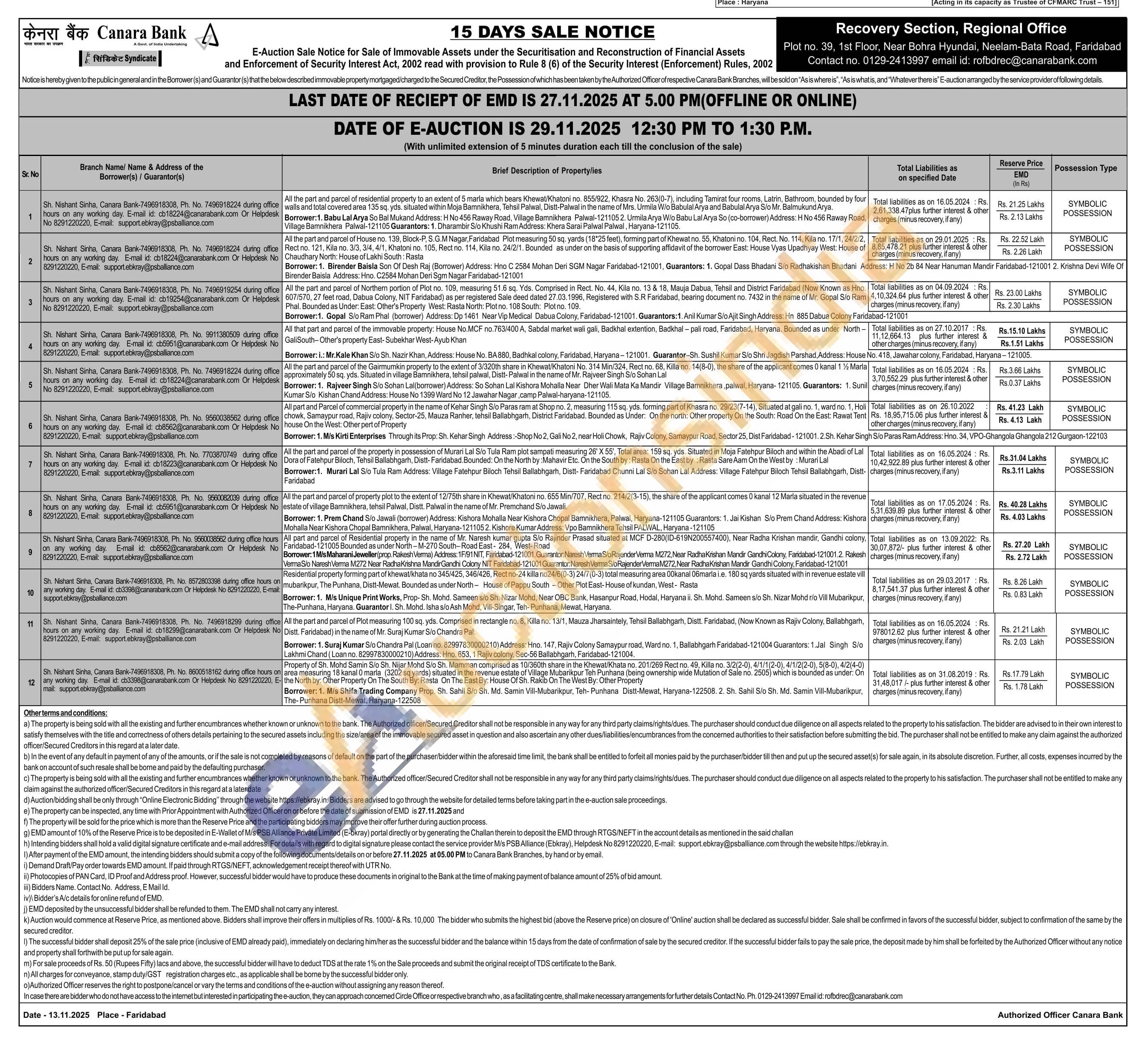 Residential property forming part of khewat/khata no 345/425, 346/426, Rect no-24 killa no24/6(0-3) 24/7(0-3) total measuring area 00kanal 06marla i.e. 180 sq yards situated with in revenue estate vill mubarikpur, The Punhana, Distt-Mewat. Bounded as under North - House of Pappu South-Other Plot East-House of kundan, West - Rasta
