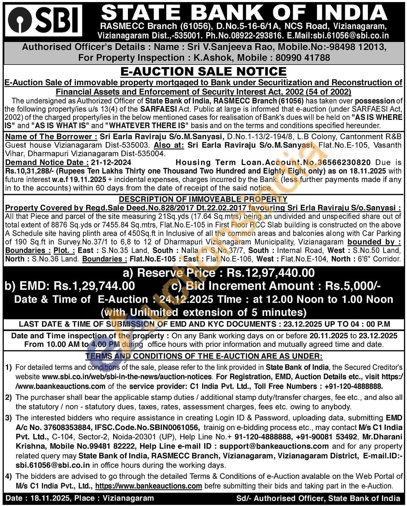 All that Piece and parcel of the site measuring 21Sq.yds (17.64 Sq.mtrs) being an undivided and unspecified share out of total extent of 8876 Sq.yds or 7455.84 Sq.mtrs, Flat.No.E-105 in First Floor RCC Slab building is constructed on the above A Schedule site having plinth area of 450Sq.ft in Inclusive of all the common areas and balconies along with Car Parking of 190 Sq.ft in Survey. No.37/1 to 6,8 to 12 of Dharmapuri Vizianagaram Municipality, Vizianagaram bounded by: Boundaries: Plot. East: S.No.35 Land, South Nalla in S.No.37/7, South Internal Road, West: S.No.50 Land, North: S.No.36 Land. Boundaries: Flat.No.E-105: East: Flat. No.E-106, West: Flat. No.E-104, North: 6'6" Corridor.