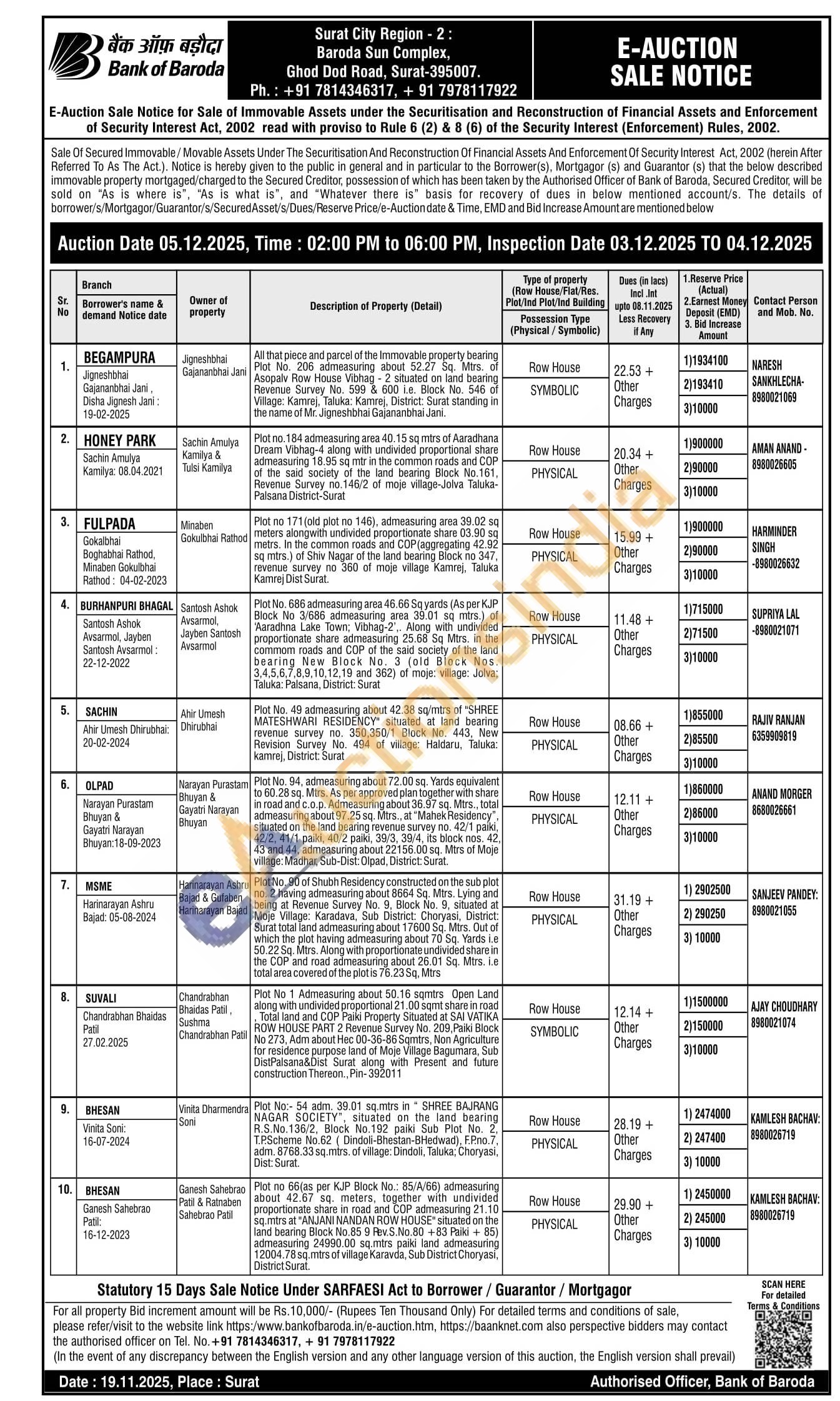 All that piece and parcel of the Immovable property bearing Plot No. 206 admeasuring about 52.27 Sq. Mtrs. of Asopalv Row House Vibhag 2 situated on land bearing Revenue Survey No. 599 & 600 i.e. Block No. 546 of Village: Kamrej, Taluka: Kamrej, District: Surat standing in the name of Mr. Jigneshbhai Gajananbhai Jani.