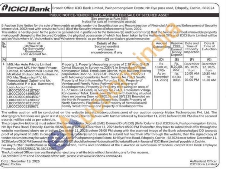Property 1: Property Measuring an area of 2.19 Ares (5.415 Cents) Situated in Survey no.2264/1 in Emakulam Village. Kanayannur Taluk, Ernakulam District. With building bearing corporation Door no. 39/2223F, 39/22236 and 39/2223H with following boundaries North: Survey No.734/2 South: Property of North Kunnathu Parambu East: Property of Vembasseril Family West: Pathway and property of Koodalaparmbu Property 2: Property measuring an area of 13.77 Ares (34 Cents) in Survey No.734/1, Ernakulam Village, Kanayannur Taluk, Ernakulam District, with building situated there on bearing Door no.39/2133 and 39/2135 Bounded on the North: Property of Koodalaparmbu South: Property of North Kunnathu Parambu East: Property of Vembalasseril Family West: Pathway and property of Koodalaparmbu