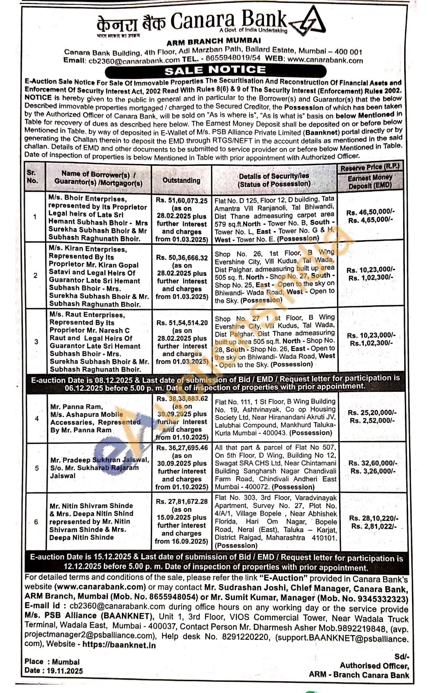 Contact Mr. Sudrashan Joshi, Chief Manager, Canara Bank, ARM Branch, Mumbai (Mob. No. 8655948054) or Mr. Sumit Kumar, Manager (Mob. No. 9345332323)