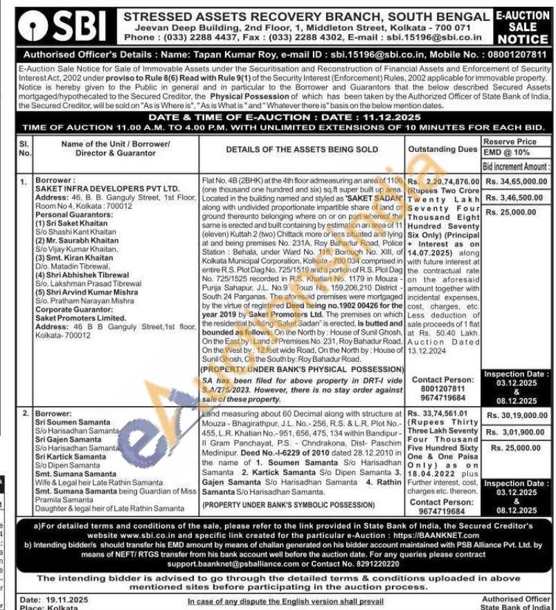 Flat No. 48 (2BHK) at the 4th floor admeasuring an area of 1106 (one thousand one hundred and six) sq.ft super built up area. Located in the building named and styled as 'SAKET SADAN' along with undivided proportionate impartible share of land or ground thereunto belonging where on or on part whereof the same is erected and built containing by estimation an area of 11 (eleven) Kuttah 2 (two) Chittack more or less situated and lying at and being premises No. 231A, Roy Bahadur Road, Police Station Behala, under Ward No. 118, Borough No. Xill, of Kolkata Municipal Corporation, Kolkata-700 034 comprised in entire R.S. Plot Dag No. 725/1519 and a portion of R.S. Plot Dag No. 725/1525 recorded in R.S. Khatian No. 1179 in Mouza Punja Sahapur, J.L. No.9, Touzi No. 159,206,210 District -South 24 Parganas. The aforesaid premises were mortgaged by the virtue of registered Deed being no. 1902 00426 for the year 2019 by Saket Promoters Ltd. The premises on which the residential building "Saket Sadan" is erected, is butted and bounded as follows: On the North by: House of Sunil Ghosh, On the East by: Land of Premises No. 231, Roy Bahadur Road. On the West by: 12 feet wide Road, On the North by: House of Sunil Ghosh, On the South by: Roy Bahadur Road.