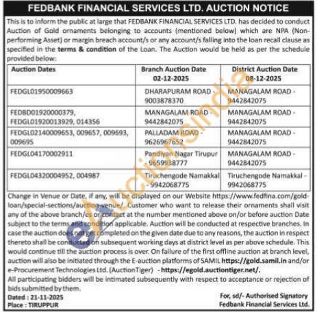 Fedbank Financial Services Ltd Gold Auctions Auction in Tiruppur