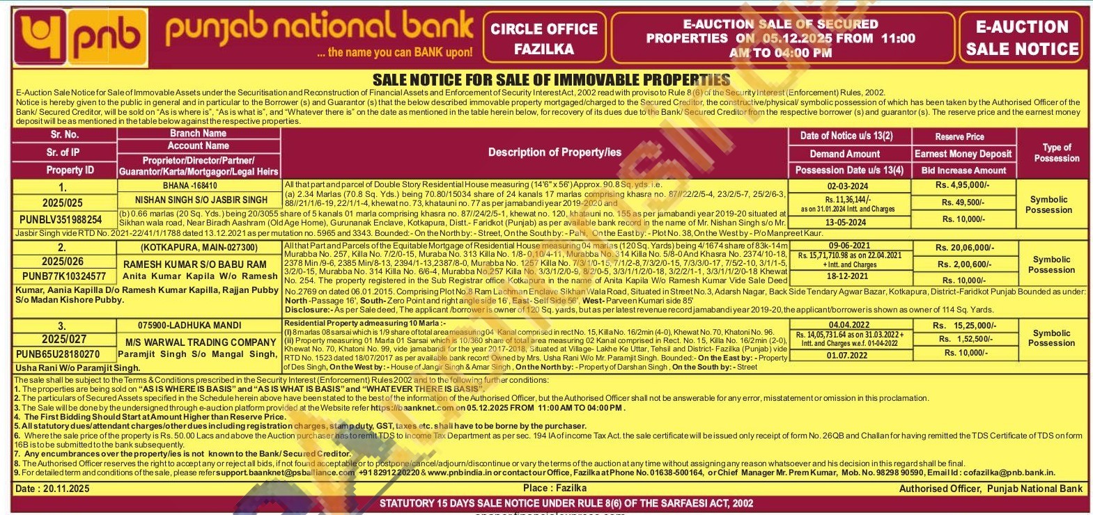 Alithat Part and Parcels of the Equitable Mortgage of Residential House measuring 04 marias (120 Sq. Yards) being 4/1674 share of 83k-14m Murabba No. 257, Killa No. 7/2/0-15, Muraba No. 313 Killa No. 1/8-0,10/4-11, Murabba No. 314 Killa No. 5/8-0 And Khasra No. 2374/10-18, 2378 Min/9-6, 2385 Min/8-13, 2394/1-13.2387/8-0, Murabba No. 1257 Killa No. 7/3/1/0-15, 7/1/2-8,7/3/2/0-15, 7/3/3/0-17, 7/5/2-10, 3/1/1-5, 3/2/0-15, Murabba No. 314 Killa No. 6/6-4, Murabba No 257 Killa No. 3/3/1/2/0-9, 8/2/0-5, 3/3/1/1/2/0-18, 3/2/2/1-1, 3/3/1/1/2/0-18 Khewat3/2/0-15, Murabba No. 314 Killa No. 6/6-4, Murabba No 257 Killa No. 3/3/1/2/0-9, 8/2/0-5, 3/3/1/1/2/0-18, 3/2/2/1-1, 3/3/1/1/2/0-18 Khewat No. 254. The property registered in the Sub Registrar office Kotkapura in the name of Anita Kapila Wio Ramesh Kumar Vide Sale DeedNo.2769 on dated 06.01.2015. Comprising Plot No.8 Ram Lachman Enclave Sikhan Wala Road, Situated in Street No. 3, Adarsh Nagar, Back Side Tendary Agwar Bazar, Kotkapura, District-Faridkot Punjab Bounded as under North-Passage 16', South-Zero Point and right angle side 16', East-Self Side 56', West-Parveen Kumari side 85 Disclosure:-As per Sale deed, The applicant/borrower is owner of 120 Sq. yards, but as per latest revenue recordjamabandiyear 2019-20, the applicant/borroweris shown as owner of 114 Sq. Yards