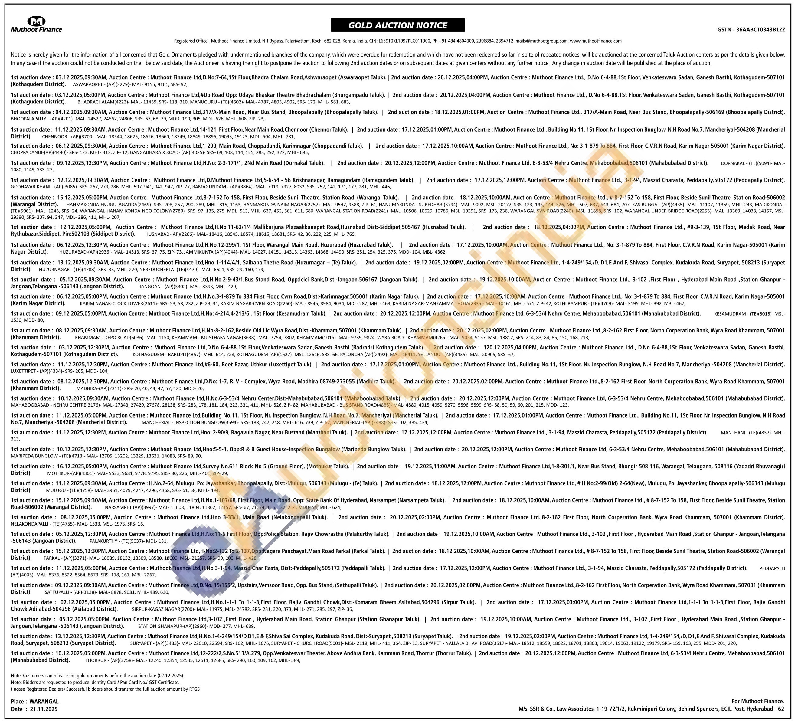Muthoot Finance Ltd Gold Auctions Auction in Warangal