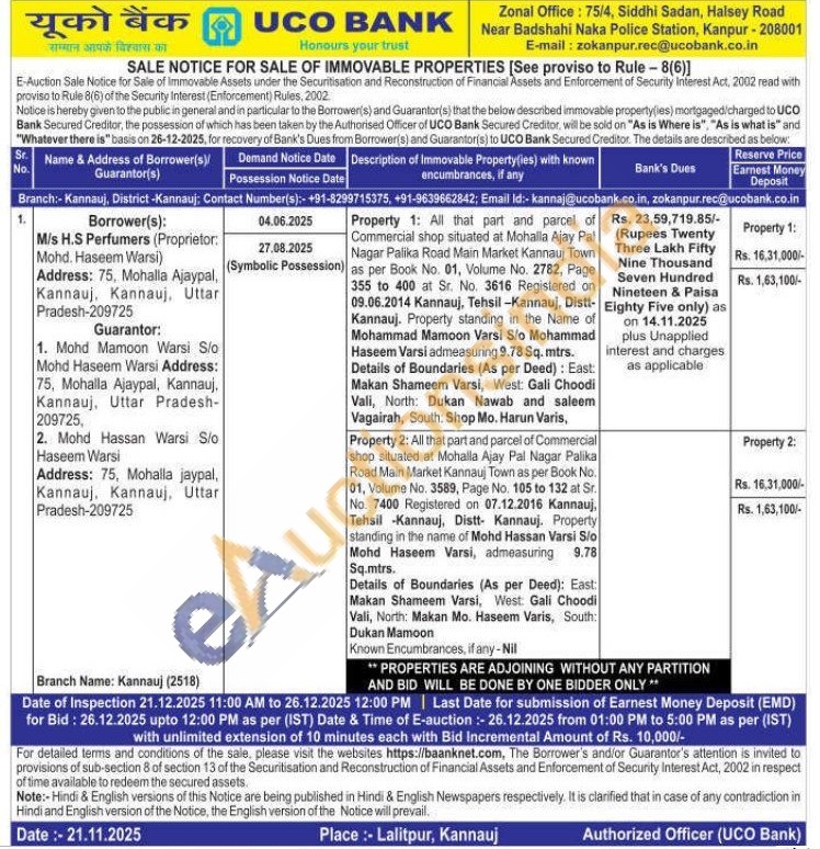 Property 1: All that part and parcel of Commercial shop situated at Mohalla Ajay Pal Nagar Palika Road Main Market Kannauj Town as per Book No. 01, Volume No. 2782, Page 355 to 400 at Sr. No. 3616 Registered on 09.06.2014 Kannauj, Tehsil-Kannauj, Distt-Kannauj. Property standing in the Name of Mohammad Mamoon Varsi Sio Mohammad Haseem Varsi admeasuring 9.78 Sq. mtrs.
