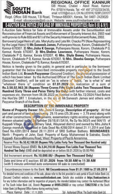 DESCRIPTION OF THE IMMOVABLE PROPERTY : Name of Property Owner: Ms. Jisha K George, Description of property: All that part and parcel of land admeasuring 29.15 ares (25.36 ares 3.79 ares) along with all other constructions, improvements, easementary rights existing and appurtenant thereon situated in Old Sy Number 28/18,61/3A1A, Re Sy No.563/5 and 564/15 of Kuppadi Village, Sulthan Bathery Taluk, Wayanad district and owned by Mrs. Jisha K George marefully described in Sale Deed No.4288/2014 dated 21.11.2014 and Sale Deed No.4391/2014 dated 28.11.2014 of SRO Sulthan Bathery, BOUNDARIES: North Property of John, East: Property of Kunju Muhammed & Sainaba, South: Kuppadi-Karuvallikkunnu Road, West: Property of Paul & Annamma