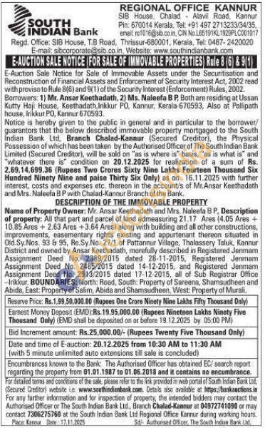 DESCRIPTION OF THE IMMOVABLE PROPERTY : Name of Property Owner: Mr. Ansar Keethadath and Mrs. Naleefa BP, Description of property: All that part and parcel of land admeasuring 21.17 Ares (4.05 Ares + 10.85 Ares + 2.63 Ares +3.64 Ares) along with building and all other constructions, improvements, easementary rights existing and appurtenant thereon situated in Old Sy Nos. 93 & 95, Re.Sy. No. 27/1 of Pattannur Village, Thalassery Taluk, Kannur District and owned by Ansar Keethadath, morefully described in Registered Jenmam Assignment Deed No. 2389/2015 dated 28-11-2015, Registered Jenmam Assignment Deed No. 2485/2015 dated 14-12-2015, and Registered Jenmam Assignment Deed No. 2513/2015 dated 17-12-2015, all of Sub Registrar Office Irikkur, BOUNDARIES: North: Road, South: Property of Sareena, Shamsudheen and Abida, East: Property of Salim, Abida and Shamsudheen, West: Property of Murali