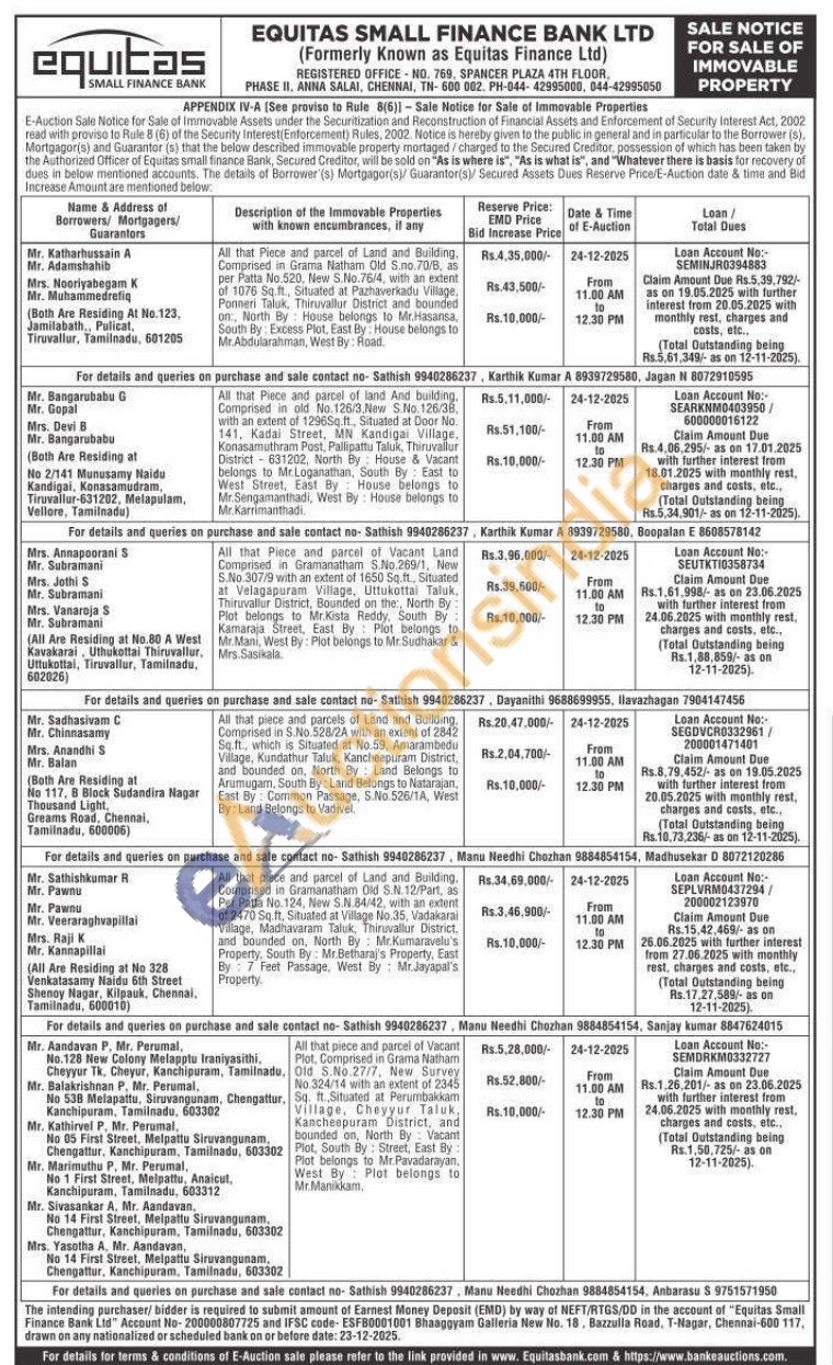 2)All that Piece and parcel of land And builting, Comprised in old No. 1263 New S. No 126/38 with an extent of 12965 ft., Situated at Door No 141, Kadal Street, MN Kandigai Village, Konasamuthram Post, Palipattu Taluk, Thiruvallur District 631202, North By House & Vacant belongs to Mr. Loganathan, South By: East to West Street, East By House belongs to Mr. Sengamanthadi, West By House belongs to Me Karrimanmad