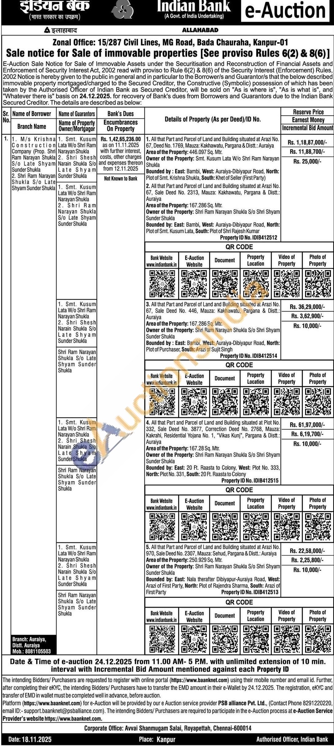 4. All that Part and Parcel of Land and Building situated at Plot No. 332, Sale Deed No. 3877, Correction Deed No. 2768, Mauza: Kakrahi, Residential Yojana No. 1, "Vikas Kunj", Pargana & Distt.: Auraiya Area of the Property: 167.28 Sq. Mtr