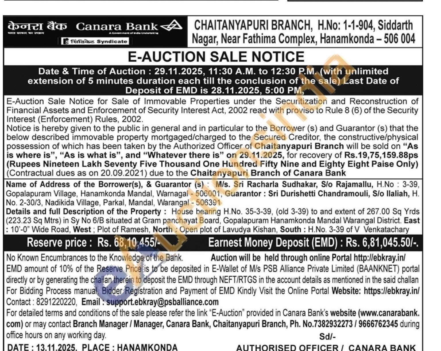 Details and full Description of the Property: House bearing H.No. 35-3-39, (old 3-39) to and extent of 267.00 Sq Yrds (223.23 Sq Mtrs) in Sy No 6/B situated at Gram panchayat Board, Gopalapuram Hanamkonda Mandal Warangal District. East : 10'-0" Wide Road, West; Plot of Ramesh, North: Open plot of Lavudya Kishan, South: H.No. 3-39 of V Venkatachary