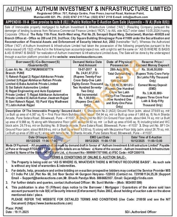 Description Of The Immovable Property/ Secured Asset: 1. Showroom No.3 (AG3) Ground Floor (adm. about 379.69 sq. mtr i,e Built up area of 4,087 sq. ft) + First Floor Work Building (adm. about 154.94 sq. mtr ie Built up area of 1,668 sq. ft) No A Sharda Arcade, Pune Satara Road, Bibwewadi, Pune 411037. 2. Shop Unit No BG1 On Ground Floor (adm. about 644.74 sq. mtr i,e Built up area of 9,988 sq. ft) along with Mezzanine Floor (adm. about 59.92 sq. mtr i,e Built up area of 645 sq. ft) including toilet and WC block adm, 26.79 sq. mtron Building No. B Sharda Arcade, Pune Satara Road, Bibwewadi, Pune 411037 3. Shop unit No. BF1 On Ground Floor (adm, about 868.99 sq. mtri,e Built up area of 9,350 sq. ft) along with Mezzanine Floor bldg (adm. about 26.79 sq. mtr. i,e Built up area of 289 sq ft.) along with terrace No. B Sharda Arcade, Pune Satara Road, Bibwewadi, Pune 411037