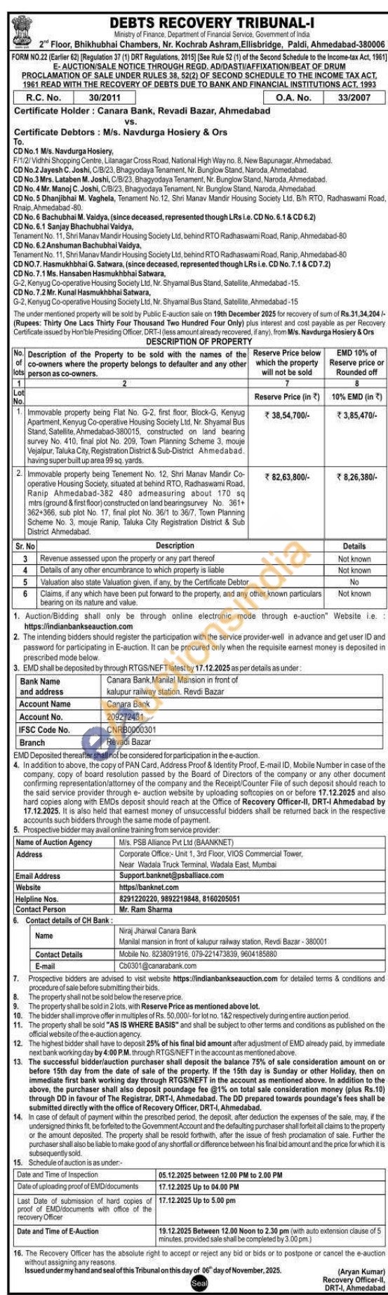 Immovable property being Flat No. G-2, first floor, Block-G, Kenyug Apartment, Kenyug Co-operative Housing Society Ltd. Nr. Shyamal Bus Stand, Satellite, Ahmedabad-380015, constructed on land bearing survey No. 410, final plot No. 209, Town Planning Scheme 3, mouje Vejalpur, Taluka City, Registration District & Sub-District Ahmedabad. having super built up area 99 sq. yards.