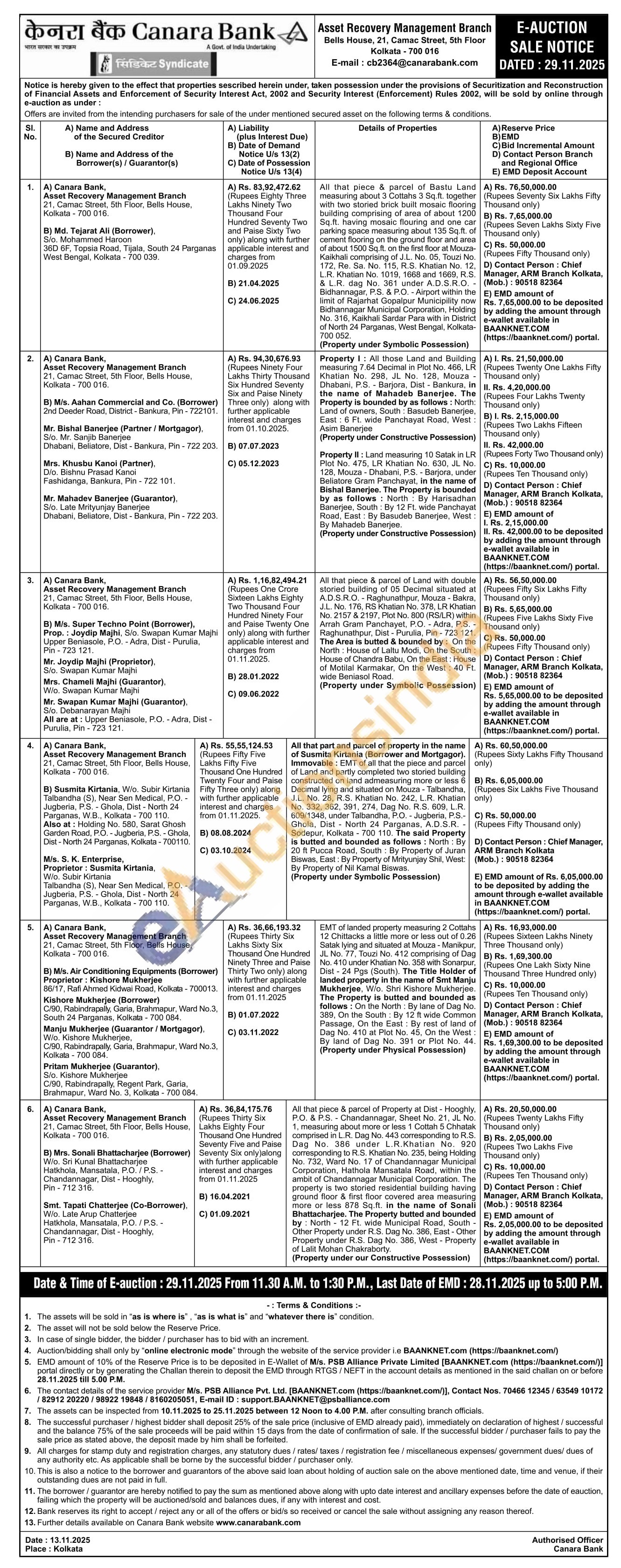 EMT of landed property measuring 2 Cottahs 12 Chittacks a little more or less out of 0.26 Satak lying and situated at Mouza - Manikpur, JL No. 77, Touzi No. 412 comprising of Dag No. 410 under Khatian No. 358 with Sonarpur, Dist-24 Pgs (South). The Title Holder of landed property in the name of Smt Manju Mukherjee, W/o. Shri Kishore Mukherjee. The Property is butted and bounded as follows: On the North: By lane of Dag No. 389, On the South By 12 ft wide Common Passage, On the East: By rest of land of Dag No. 410 at Plot No. 45, On the West: By land of Dag No. 391 or Plot No. 44. (Property under Physical Possession)
