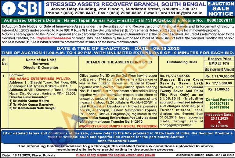 Office space No.3D on the 3rd Floor having super built area of 1744 sq.ft. be the same a little more or less in the building known as "Shrachi Tower" together with 2 covered Car parking space bearing Nos. B-7 and B-8 in the basement of the said building together with the undivided proportionate share of unexpired period of lease hold right in respect of land measuring about 43.24 cottahs in Plot No-1-25/B/1 in East Kolkata Area Development Project at premises no-686, Anandapur, Eastern Metropolitan Bypass, P.S.-Kasba, Dist-24 Parganas(S) registered in the name of M/s Aanag Enterprises Pvt Ltd vide deed of Assignment cum Transfer No. 1-12910