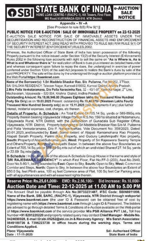 Property therein bearing Vijayawada Village Portion R.S.No. 156/1a situated at Nidamanuru. Vijayawada Rural, NTR District, with the Jurisdiction of Gunadala Sub Register Office, Vijayawada, NTR District, Property belonging to Sri Maddela Bhaskar Rao S/o M. Pullanna and Polla Venkataramana, Dio P. Narasimha Rao, Vide Document No: 358/2023, Dated: 20.01.2023, and bounded by East: Some extent of Alapati Ramamohana Rao Property. Alapati Sarath Property, Parimi Ravi Property, and Guduru Lakshmipathi Rao property, South: Property of AlapatiSubramanyam, West: Property of Sri Rajeswara Swamy Temple and Others Property, North: Panchayathi Bazar. In between the above four Boundaries an Extent of 705.14 Sq.yds or 589.89 Sq.mts out of which an undivided Shareof 27.14 Sq. yards or 22.69 Sq.mlsof site.