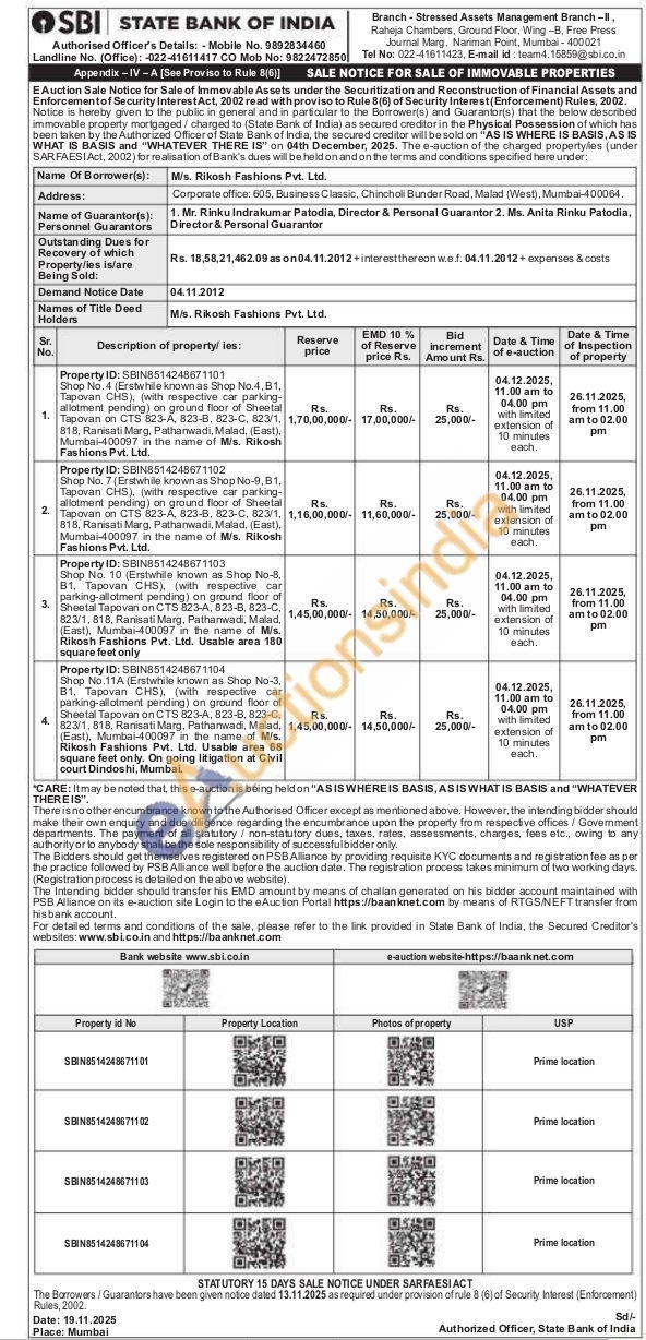 Property ID: SBIN8514248671104 Shop No.11A (Erstwhile known as Shop No-3, B1. Tapovan CHS), (with respective car parking-allotment pending) on ground floor of Sheetal Tapovan on CTS 823-A, 823-B, 823-C, 823/1, 818, Ranisati Marg, Pathanwadi, Malad, (East), Mumbai-400097 in the name of M/s. Rikosh Fashions Pvt. Ltd. Usable area 68 square feet only. On going litigation at Civil court Dindoshi, Mumbai.
