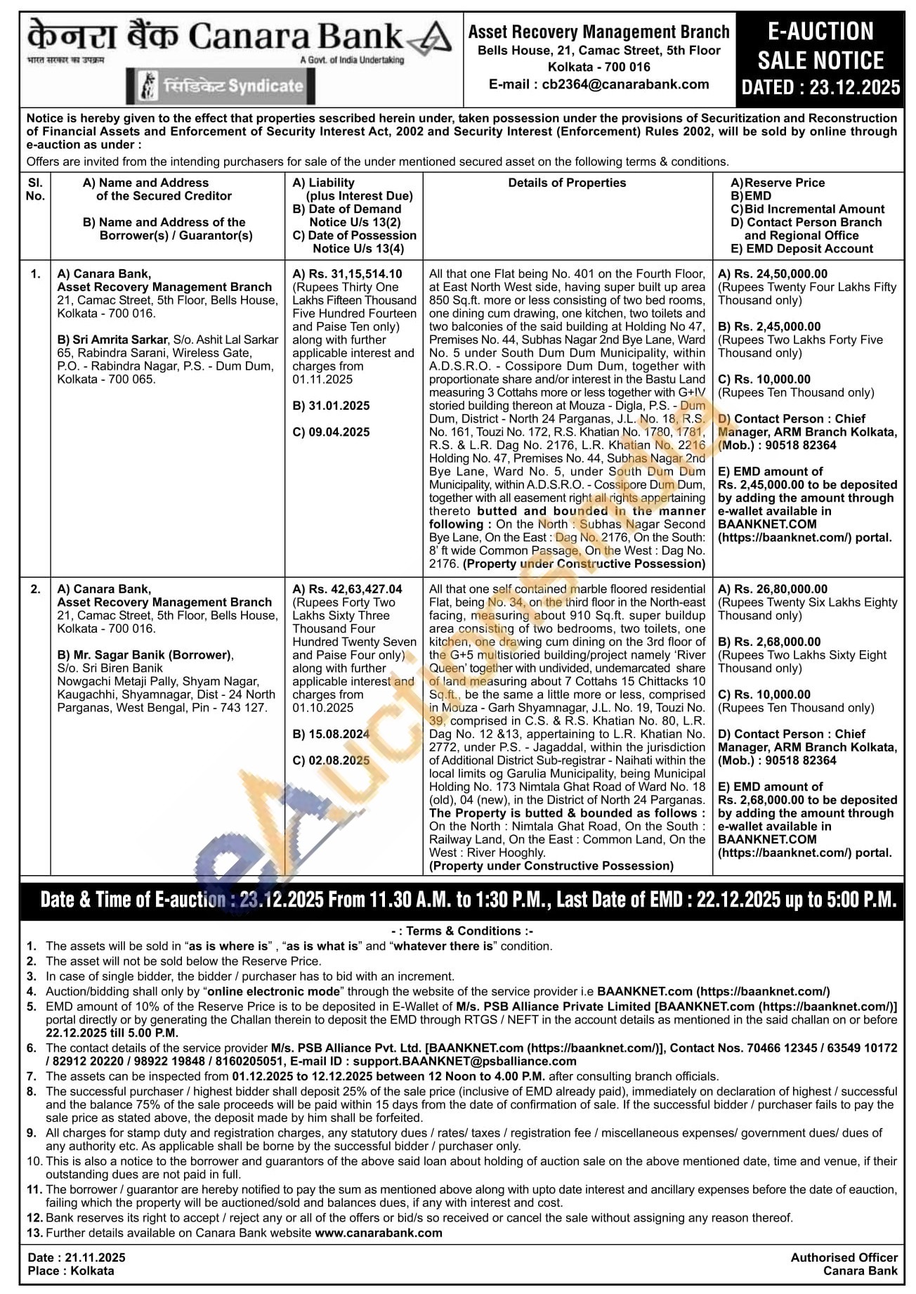 Contact Person: Chief Manager, ARM Branch Kolkata, (Mob.): 90518 82364