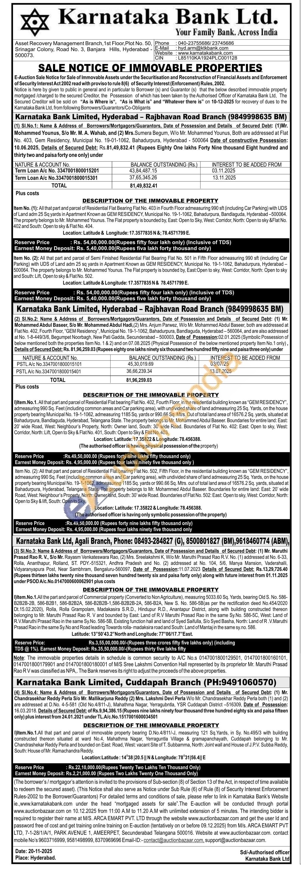 I)Item.No.1.All the part and parcel of Commercial property (Converted to Non Agriculture), measuring 5033.60 Sq. Yards, bearing Old S. No. 586-B2B2B-2B, 586-B281, 586-B2B2A, 586-B2B2B-1,586-B2B2B-2A, 586-B2A, New S. No. 586-5B(as per the rectification deed No.454/2020 Dt.15.02.2020), Rolla, Rolla Grampolam, Madakasira S.R.D., Hindupur R.D., Anantapur District, along with building constructed thereon belonging to Mr. Maruthi Prasad Rao R. V and bounded by East: Land of R.V Maruthi Prasad Rao in the same Sy.No. 586-5C, West: Land of R.V.Maruthi Prasad Rao in the same Sy.No. 586-5B, Existing function hall and land of Syed Saifulla, S/o Syed Basha, North: Land of R.V.Maruthi Prasad Rao in the same Sy. No and Road leading Towards rolla-madaksira road and South: Land of Mantaj in the same sy.no. 586.