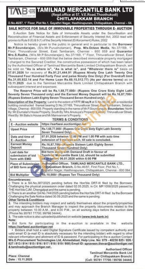 Description of the Property: Land to the extent of 1777.50 sq.ft at S. No. 98/28, with a residential building constructed thereat bearing D. No.37/169. Thiruvalluvar Street. East Tambaram, Selaiyur Village, Chennai-600059. Property standing in the name of Mr.P.Soundarajan Boundaries: North By: Mr.Elumalai's House Property, South By: Mrs. Anusuya's Property, East By: Thiruvalluvar Street. West By: Mr. Babu's House and Mr. Manivannan's Property.