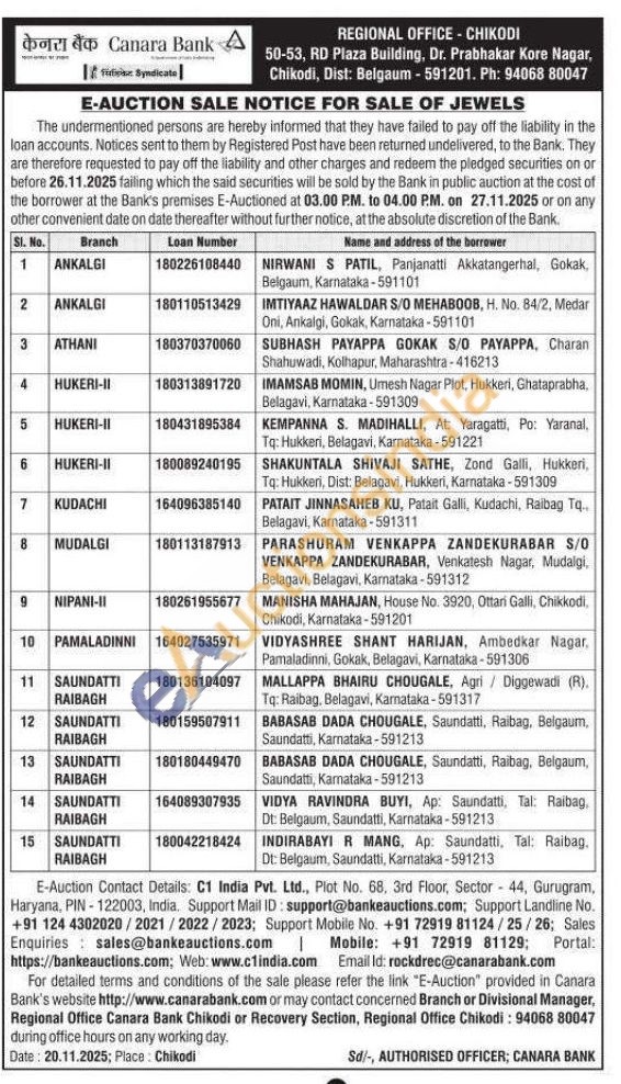 Canara Bank Gold Auctions Auction in Belagavi