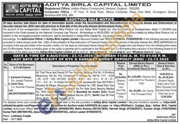 All That Piece And Parcel Of The Property Bearing Plot No. 4 (Portion) Measuring 135 Sq. Yds Comprised In Khasra No. 24/16-17/1-5//24 25-21/2-153-8/7/2/2-6/25/2-8/4/1-4/3-5/1/1-8-9-10-11/1-7/5-6-15 Khata No. 29/35 To 50 Jamabandhi Year 2010-2011 Situated At Village- Bhamiyan Khurd, Hadbast No.-180, Abadi Ram Das Nagar, Tehsil And District Ludhiana As Per Sale Deed Bearing Wasika No. 7654 Dated 28/07/2021 And is Bounded As Under: East: Road 20 Feet Wide: 33 FL., West: Brajesh Kumar, 33 FL, North: Gali 20 Feet Wide, 37 FL., South: Rampal: 37 FL
