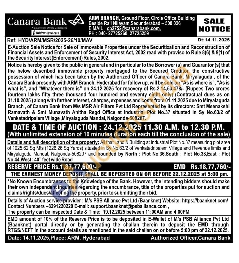 Details and full description of the property: All that Land & Building at Industrial Plot No.37 measuring plot area of 1025.62 Sq Mts (1226.26 Sq Yards) situated in Sy No.63/2 of Venkatadripalem Village and Revenue limits and Miryalaguda Mandal, Nalgonda-508207 and bounded by North: Plot No.36, South Plot No.38, East: Plot No.44, West: 40" feet wide Road