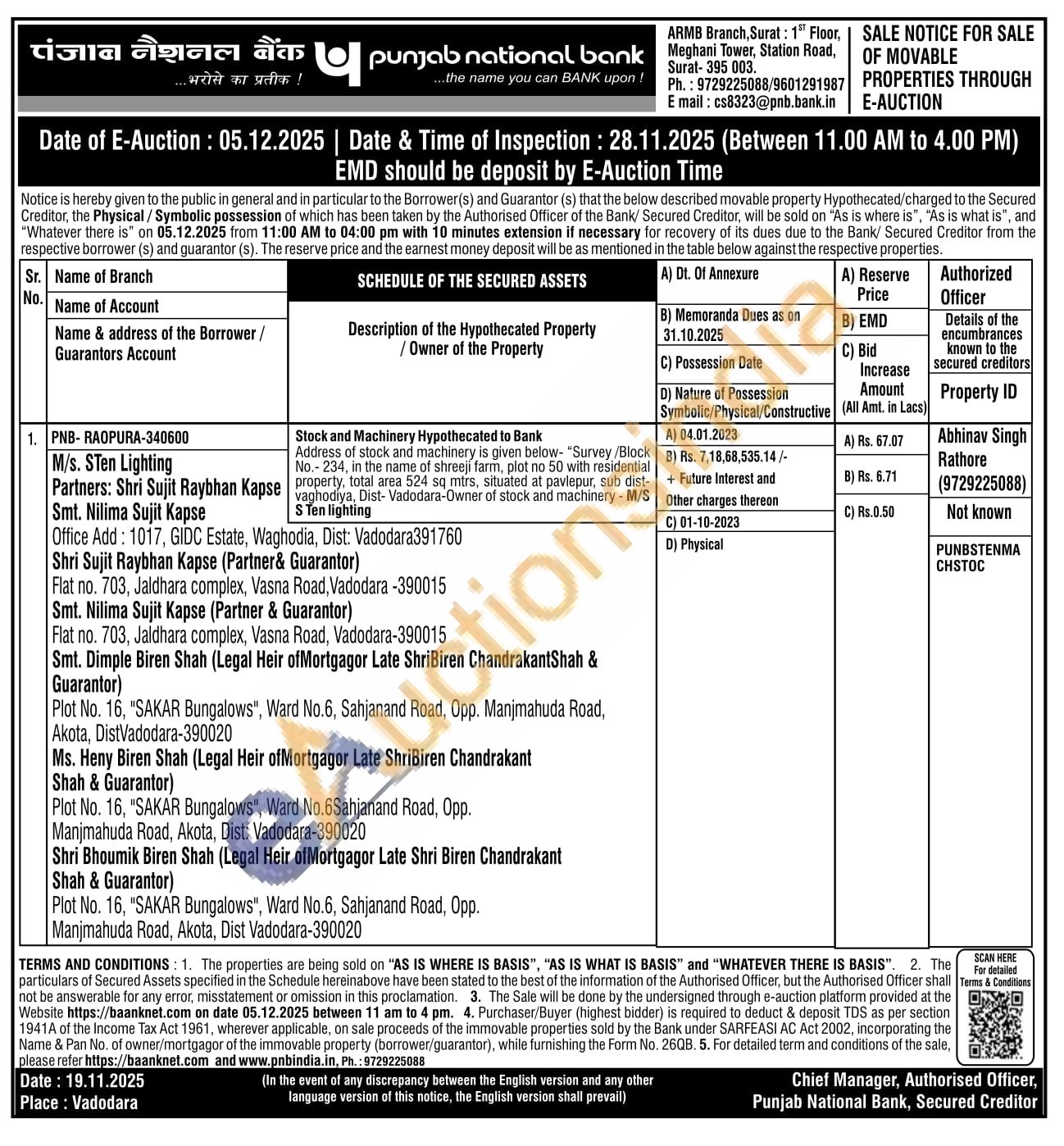 Stock and Machinery Hypothecated to Bank Address of stock and machinery is given below- "Survey/Block No.- 234, in the name of shreejí farm, plot no 50 with residential property, total area 524 sq mtrs, situated at pavlepur, sub dist-vaghodiya, Dist- Vadodara-Owner of stock and machinery - M/S S Ten lighting