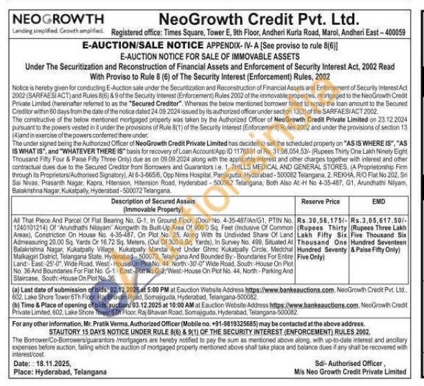 All That Piece And Parcel Of Flat Bearing No. G-1, In Ground Floor, (Door No. 4-35-487/An/G1, PTIN No. 1246101214) Of "Arundhathi Nilayam Alongwith its Built-Up Area Of 900.0 Sq. Feet (Inclusive Of Common Areas), Constriction On House No 4-36-487, On Plot No. 35, Along With its Undivided Share Of Land Admeasuring 20.00 Sq. Yards Or 16.72 Sq. Meters, (Out Of 300.0 Sq. Yards), In Survey No. 499, Situated At Balakrishna Nagar, Kukatpally Village, Kukatpally Mandai And Under Ghrmc Kukatpally Circle, Medichal Malkajgiri District, Telangana State, Hyderabad-500072 Telangana And Bounded By-Boundaries For Entire Land: East-25-0", Wide Road, West-House On Plot No. 44, North: -30-0" Wide Road, South: -House On Plat No. 36 And Boundaries For Flat No. G-1-East-Fiat No G-2, West-House On Plot No. 44, North-Parking And Staircase, South: House On Plot No. 36.