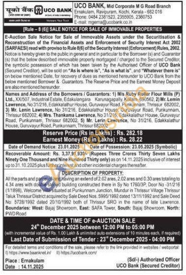 All the parts and parcel of land having an extend of 2.02 ares, 2.02 ares and 0.30 ares totaling to 4.34 ares with double storied building constructed there in Sy No 1760/3P, Door No -31/216 (1/1898), Welcome Villa situated at Punkunnam Junction, Mundur in Thrissur Village Thrissur Taluk Thrissur District acquired by Sale Deed Nos. 5995/1992 dated 13/11/1992 and Sale Deed No 5728/1992 dated 20/10/1992 both of Thrissur SRO in the name of late Lawrence. Boundaries: West: Bajaj Showroom, East: SAFA Tower, South: Bajaj Showroom, North: PWD Road