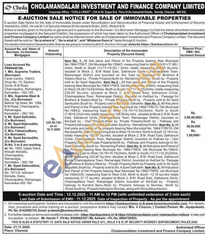 Item No. 1: All that piece and Parcel of the Property bearing New Municipal No. 1964/1795/7, Old Municipal No.1584/2, measuring East to West (19.81+17.98)/2mtrs, North to South (13.71+14.32)/2mtrs, totally measuring 265.05 Sq.mtrs. situated at Block 2. B.M Road East, Sathanure Circle, Channapatana Town, Ramanagar District and bounded on the East by: Passage for Brothers & Sisters, West by: Private Property, North by: Remaining Portion, South by: Property sold to Sri Syed Najjuddin. Item No.2: All that piece and Parcel of the Property bearing New Municipal No. 1964/1795/8, Old Municipal No. 1584/2, measuring East to West (18.29+14.63)/2mtrs, North to South (13.71+14.32)/2mtrs, totally measuring 230.85 Sq.mtrs. situated at Block 2. B.M. Road East, Sathanure Circle, Channapatana Town, Ramanagar District, bounded on the East by Passage for Brothers & Sisters, West by: Private Property, North by Property sold to Sri Syed Samiuddin, South by: Property sold to Sri. Syed Zafraddin. Item No. 3: All that piece and Parcel of the Property bearing New Municipal No. 1964/1795/10, Old Municipal No. 1584/2, measuring East to West (16.15+15.54)/2mtrs, North to South (7.92+8.23)/2 mtrs, totally measuring 128.06 Sq.mtrs., situated at Block 2, B.M. Road East, Sathanure Circle, Channapatana Town, Ramanagar District, bounded on the East by Own Property, West by: Private Property North by Pathway and Property belongs to Sri. Syed Zafruddin, South by: Remaining Portion. Item No. 4: All that piece and parcel of the property bearing New Municipal No. 1964/1795/10, Old Municipal No. 1584/2, measuring East to West 15.24 mirs, North to South 12.19 m trs, totally measuring 185.87 Sq.mirs, situated at Block 2, B.M. Road East, Sathanure Circle, Channapatana Town, Ramanagar District, bounded on theEast by: Own Property, West by: Private Property, North by: Pathway and Property belongs to Sri. Syed Zafruddin, South by: Remaining Portion. Item No. 5: All that piece and Parcel of the Property bearing New Municipal No. 1964/1795/4, Old Municipal No. 1584/2. measuring East to West (16.76-16.15)/2mtrs, North to South (13.71+14.32)/2mtrs, totally measuring 230.85 Sq.mtrs. situated at Block 2, B.M. Road East, Sathanure Circle, Channapatana Town, Ramanagar District, bounded on the East by: Passage for Brothers & Sisters, West by: Private Property, North by Property sold to Sri Syed Najjuddin, South by: Property sold to Sri. A Syed Saifuddin. Item No. 6: All that piece and Parcel of the Property bearing New Municipal No. 1964/1795/6, old Municipal No.1584/(2)/6, measuring East to West 3.04, North to South -12.19 sq.mtrs totally measuring 37.17 sq.mirs, situated at Block 2, B M. Road East, Sathanure Circle, Channapatana Town, Ramanagar District, bounded on the East by: Property belongs to Kurshid Banu, West by: Property belongs to Mumtaz, North by Road, South by: Property belongs to Mumtaz, along with the building thereon.