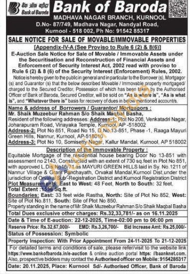 Equitable Mortgage of the residential house bearing Door No 13-851 with assessment no 2143, Constructed with an extent of 730 sq. feet in Plot No 851, with approved L. Dis. No16/71 as MAYURI GREEN HILLS laid in Sy. No 1211 of Nannur Village & Gram Panchayath, Orvakal Mandal, Kurnool Dist, under the jurisdiction of Orvakal Sub-Registration District and Kumool Registration DistrictPlot Measurements: East to West: 48 Feet, North to South: 32 feet, Total Extent: 1536 Sq.ft. Boundaries: East: 33 feet wide Rastha, North: Site of Plot No 852. West: Site of Plot No.811, South: Site of Plot No 850. Property standing in the name of Mr. Shaik Muzeebur Rahman Sio Shaik Maqbal