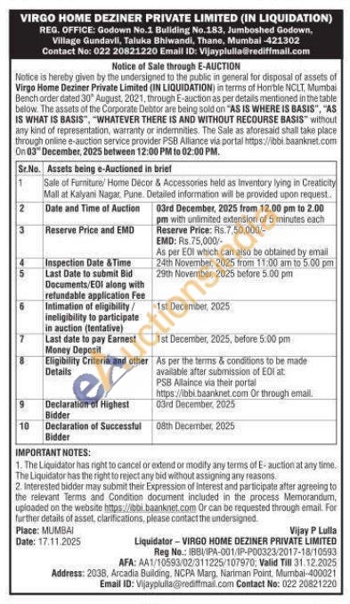 Sale of Furniture/ Home Décor & Accessories held as Inventory lying in Creaticity Mall at Kalyani Nagar, Pune. Detailed information will be provided upon request