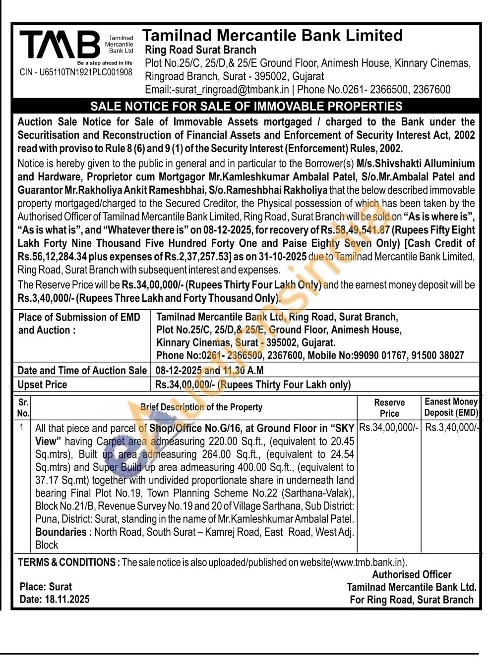 All that piece and parcel of Shop/Office No.G/16, at Ground Floor in "SKY View" having Carpet area admeasuring 220.00 Sq.ft., (equivalent to 20.45 Sq.mtrs), Built up area admeasuring 264.00 Sq.ft., (equivalent to 24.54 Sq.mtrs) and Super Build up area admeasuring 400.00 Sq.ft., (equivalent to 37.17 Sq.mt) together with undivided proportionate share in underneath land bearing Final Plot No.19, Town Planning Scheme No.22 (Sarthana-Valak), Block No.21/B, Revenue Survey No. 19 and 20 of Village Sarthana, Sub District: Puna, District: Surat, standing in the name of Mr.Kamleshkumar Ambalal Patel. Boundaries: North Road, South Surat - Kamrej Road, East Road, West Adj. Block