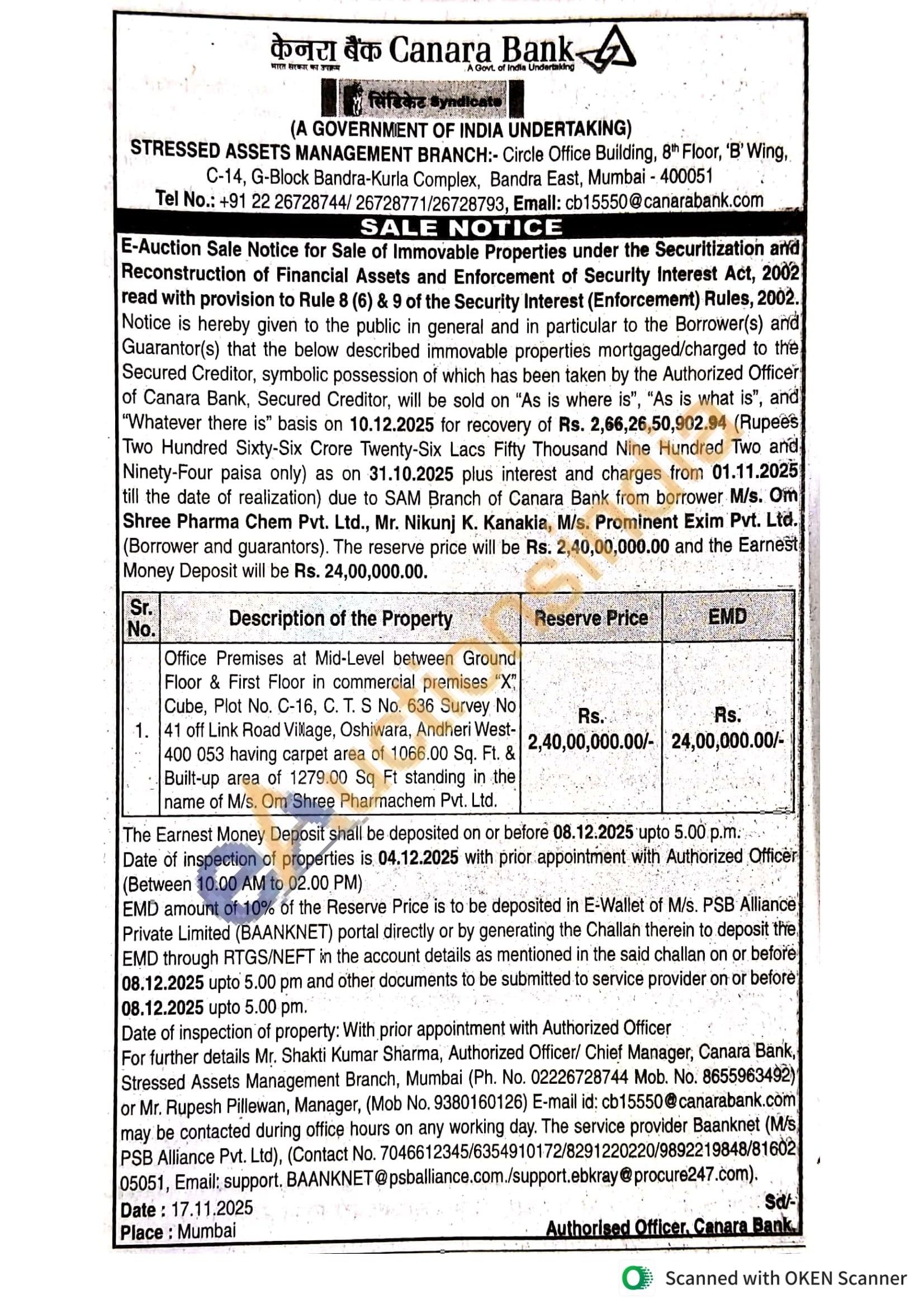 Office Premises at Mid-Level between Ground Floor & First Floor in commercial premises "X" Cube, Plot No. C-16, C. T. S No. 636 Survey No 41 off Link Road Vilage, Oshiwara, Andheri West-400 053 having carpet area of 1066.00 Sq. Ft. & Built-up area of 1279.00 Sq Ft standing in the name of M/s. Om Shree Pharmachem Pvt. Ltd