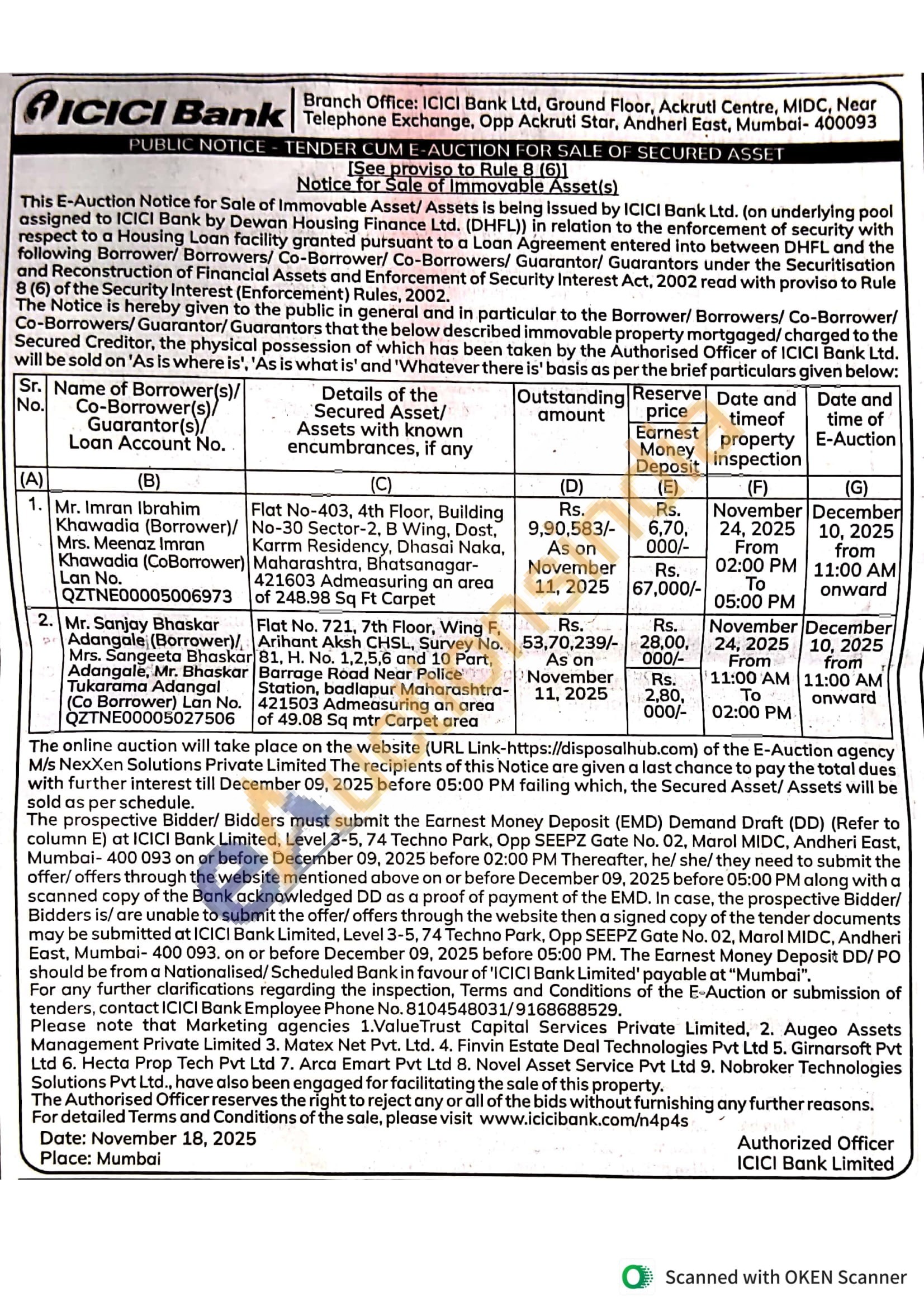 Flat No-403, 4th Floor, Building No-30 Sector-2, B Wing, Dost, Karrm Residency, Dhasai Naka, Maharashtra, Bhatsanagar-421603 Admeasuring an area of 248.98 Sq Ft Carpet