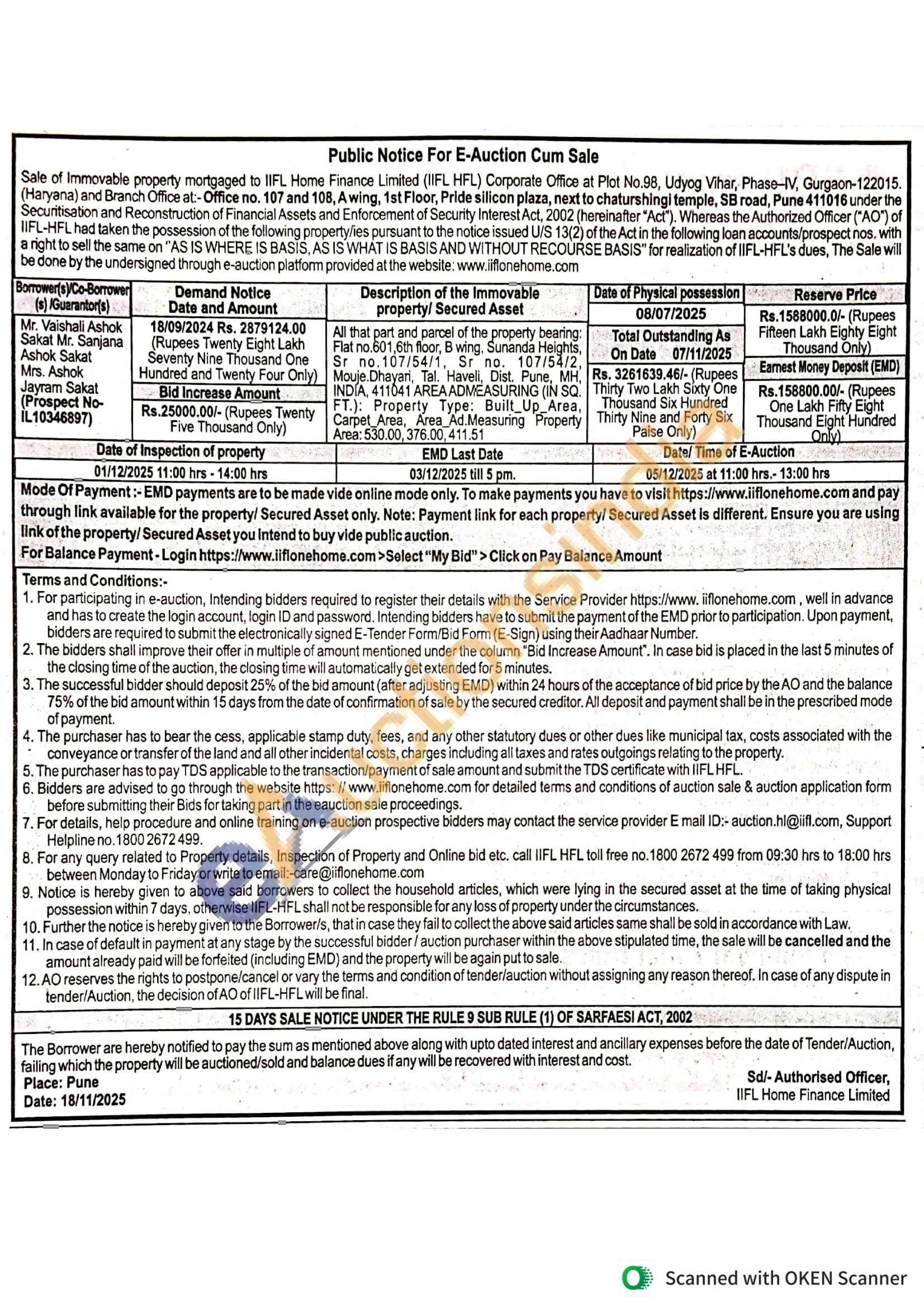All that part and parcel of the property bearing: Flat no.601,6th floor, B wing, Sunanda Heights, Sr no.107/54/1, Sr no. 107/54/2, Mouje. Dhayari, Tal. Haveli, Dist. Pune, MH, INDIA, 411041 AREA ADMEASURING (IN SQ. FT.): Property Type: Built_Up_Area, Carpet Area, Area Ad. Measuring Property Area: 530.00, 376.00,411.51