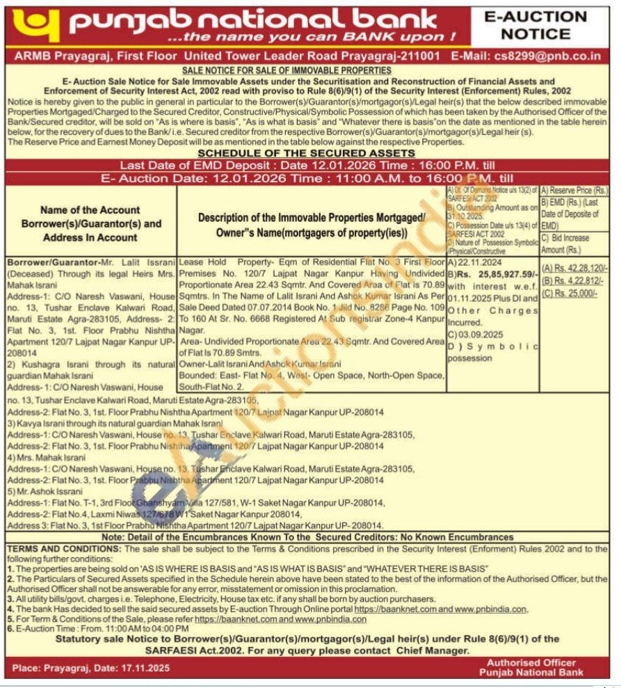 Lease Hold Property- Eqm of Residential Flat No. 3 First Floor Premises No. 120/7 Lajpat Nagar Kanpur Having Undivided Proportionate Area 22.43 Sqmtr. And Covered Area of Flat Is 70.89 Sqmtrs. In The Name of Lalit Israni And Ashok Kumar Israni As Per Sale Deed Dated 07.07.2014 Book No. 1 Jild No. 8286 Page No. 109 To 160 At Sr. No. 6668 Registered At Sub registrar Zone-4 Kanpur Nagar. Area- Undivided Proportionate Area 22.43 Sqmtr. And Covered Area of Flat Is 70.89 Smtrs. Owner-Lalit Israni And Ashok Kumar Israni Bounded: East- Flat No. 4, West- Open Space, North-Open Space, South-Flat No. 2.