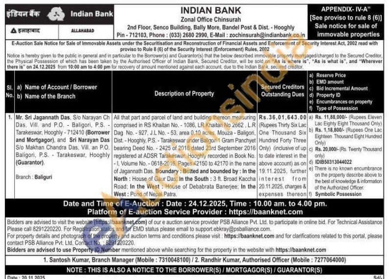All that part and parcel of land and building thereon measuring comprised in RS Khaitan No. 1086, LR Khaitan No 2662, LR Dag No.-927, J.L No.-53, area 0.10 acres, Mouza - Baligori, Dist.-Hooghly, P.S.-Tarakeswar under Baligori 1 Gram Panchyet bearing Deed No.-2425 of 2016 dated 23rd September 2016 registered at ADSR Tarakeswar, Hooghly recorded in Book No. -1, Volume No.-0618-2016, Pages 42150 to 42170 in the name of Jagannath Das. Boundary: Butted and bounded by: In the North: House of Gaur Das, In the South: 3 ft. Broad Kaccha Road: In the West: House of Debabrata Banerjee, In the West: Pond of Nepal Patra.