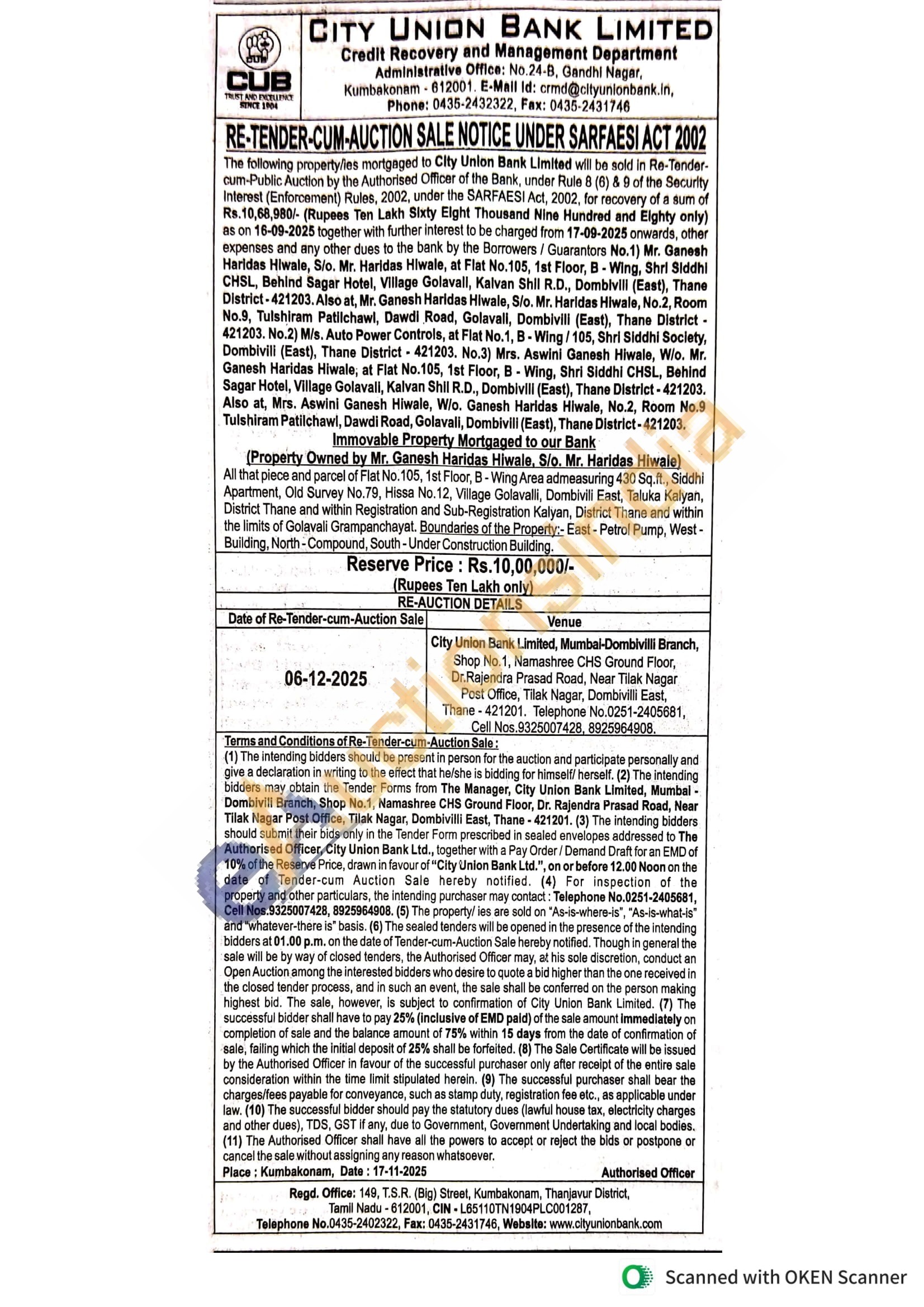 All that piece and parcel of Flat No. 105, 1st Floor, B-Wing Area admeasuring 430 Sq.ft., Siddhi Apartment, Old Survey No.79, Hisse No. 12, Village Golavalli, Dombivili East, Taluka Kalyan, District Thane and within Registration and Sub-Registration Kalyan, District Thane and within the limits of Golavali Grampanchayat. Boundaries of the Property:- East-Petrol Pump, West-Building, North-Compound, South-Under Construction Building.