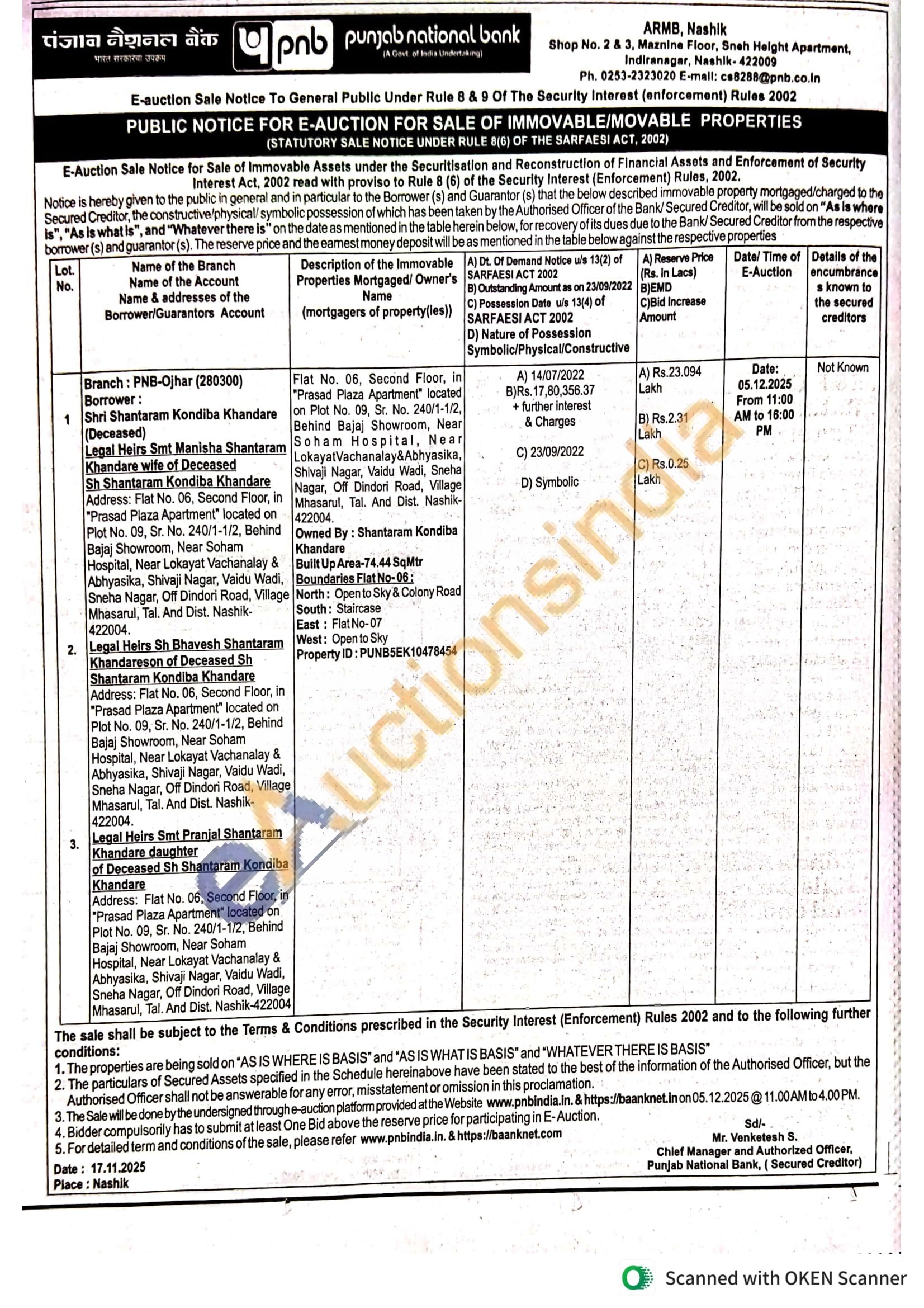 Flat No. 06, Second Floor, in "Prasad Plaza Apartment" located on Plot No. 09, St. No. 240/1-1/2, Behind Bajaj Showroom, Near Soham Hospital, Near Lokaya!Vachanalay&Abhyasika, Shivaji Nagar, Vaidu Wadi, Sneha Nagar, Off Dindorn Road, Village Mhasarul, Tal. And Dist. Nashik-422004. Owned By: Shantaram Kondiba Khandare Built Up Area-74.44 SqMtr Boundaries Flat No-06: North: Open to Sky & Colony Road South: Staircase East: Flat No-07 West: Open to Sky Property ID: PUNB5EK10478454