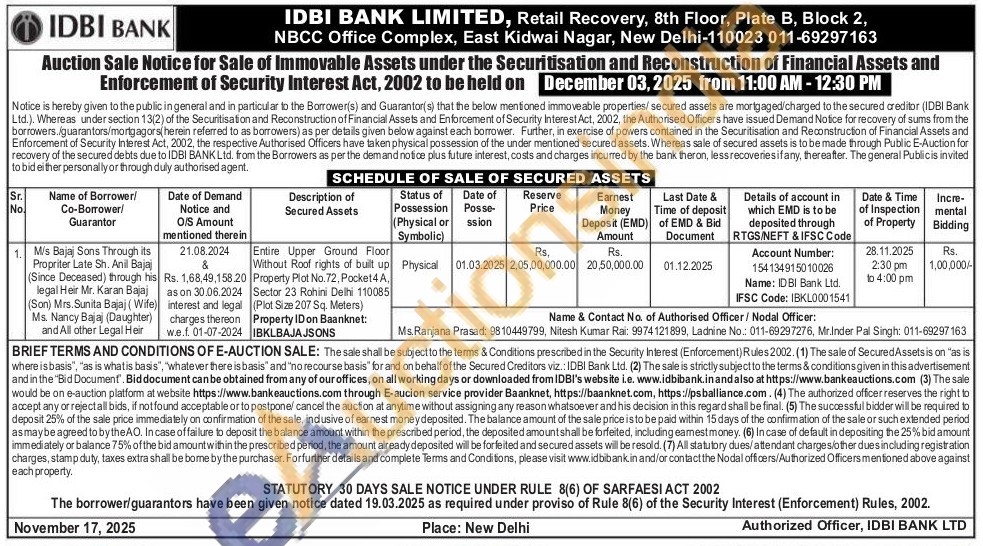 Entire Upper Ground Floor Property Plot No. 72, Pocket 4A, Sector 23 Rohini Delhi 110085 (Plot Size 207 Sq. Meters) Property ID on Baanknet: IBKLBAJAJSONS Without Roof rights of built up
